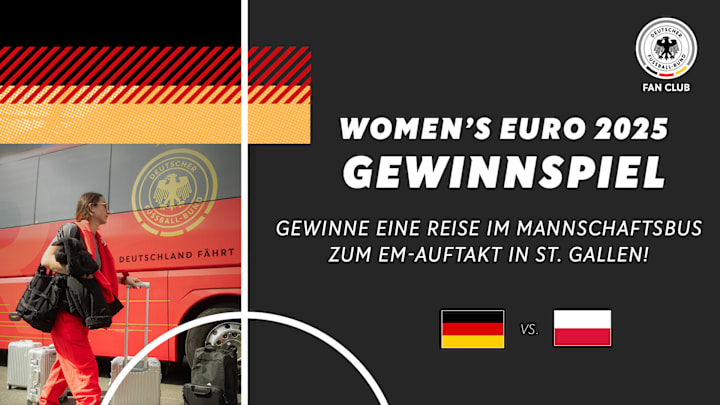 Sei dabei, wenn unsere DFB-Frauen am 4. Juli in St. Gallen gegen Polen in die EM starten. Der Fan Club Nationalmannschaft verlost unter teilnehmenden Mitgliedern ein Rundum-Fanerlebnis für den Auftakt der UEFA Women’s EURO 2025 in der Schweiz.
