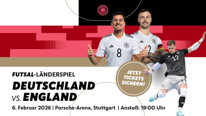 Das erste Highlight der Futsal-Nationalmannschaft im Jahr 2026 steht fest. Am 6. Februar 2026 trifft das Team von Bundestrainer Marcel Loosveld in Stuttgart auf England. Tickets sind nun erhältlich - mit Weihnachtsrabatt.