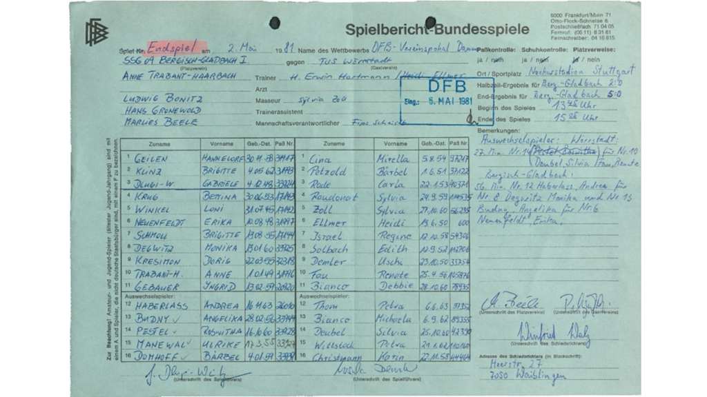 Die SSG 09 Bergisch Gladbach gewinnt 1981 das erste Finale um den DFB-Pokal der Frauen durch ein 5:0 gegen den TuS Wörrstadt.