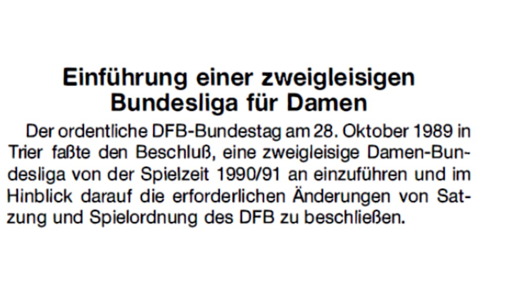 Der DFB-Bundestag beschließt die Gründung einer zweigleisigen Frauenfußball-Bundesliga. Erster Meister ist in der Saison 1990/91 der TSV Siegen. Seit 1997 wird die Bundesliga eingleisig ausgetragen