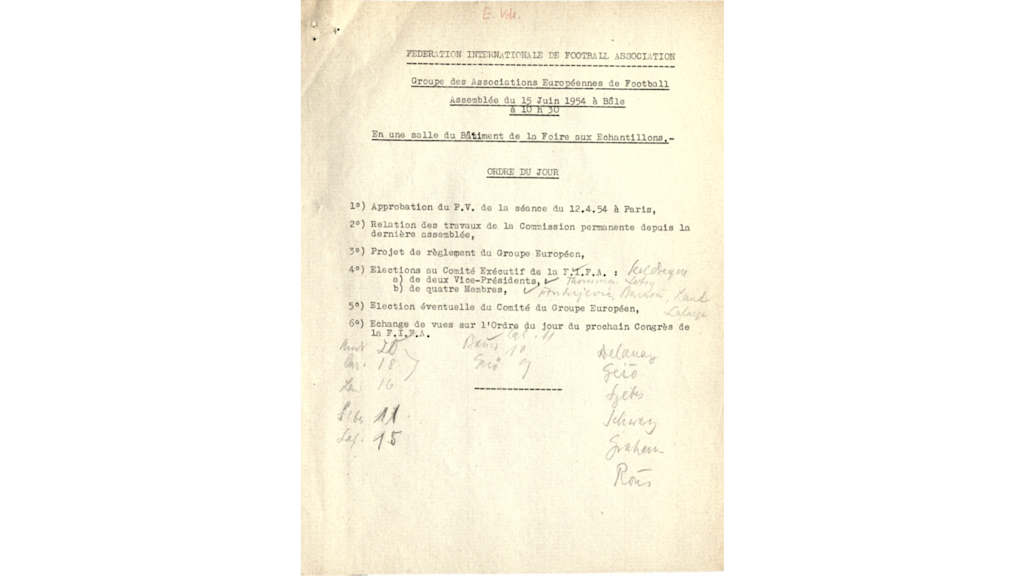Der DFB ist eines der 31 Gründungsmitglieder. Tagesordnung der Versammlung europäischer Fußballverbände zur Gründung der UEFA am 15. Juni 1954 in Basel.