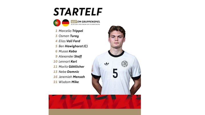 Mit zwei Veränderungen geht die U 17 bei der EM in Albanien in das entscheidende Gruppenspiel heute (ab 20.30 Uhr) gegen Portugal. Die Aufstellung: Trippel - Turay, Vali Fard, Hawighorst (K), Kaba, Staff, Karl, Göttlicher, Domnic, Mensah, Mike.