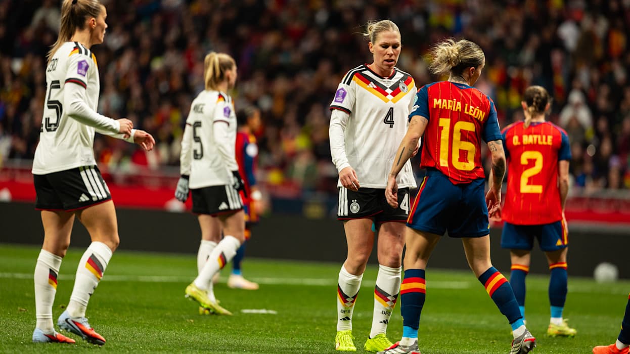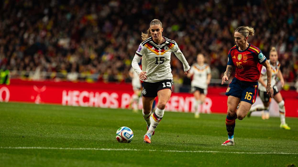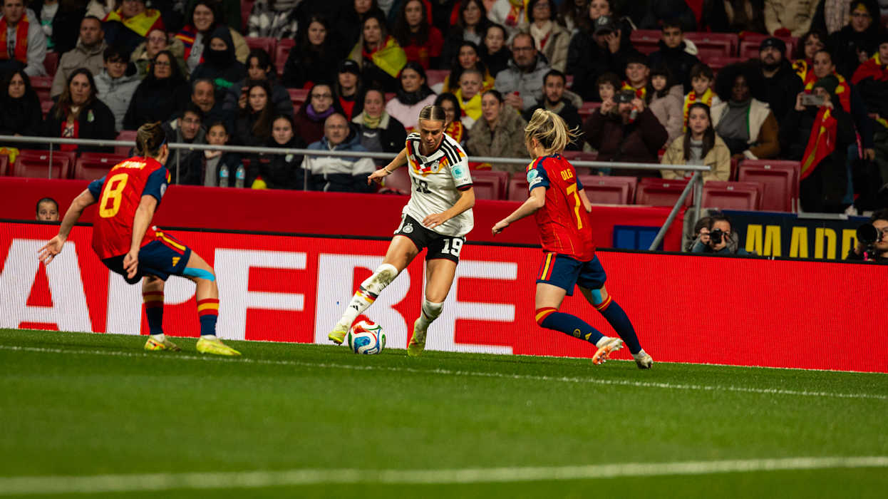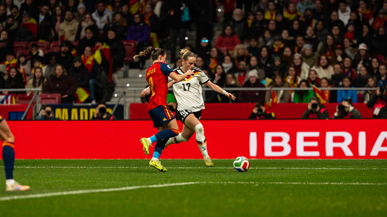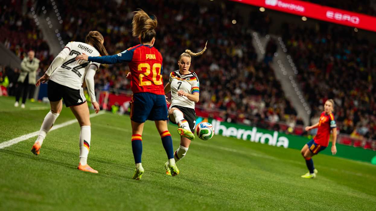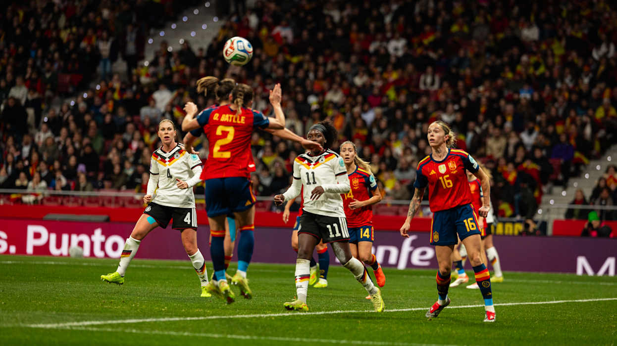 Im Estadio Metropolitano der spanischen Hauptstadt hatten die Gastgeberinnen vor 55.843 Zuschauer*innen zunächst mehr Ballbesitz, die deutsche Elf war aber giftig in den Zweikämpfen. Trotzdem hatten die Gastgeberinnen nach feinem Zusammenspiel durch Esther Gonzalez' Flachschuss (4.) und den Kopfball von Alexia Putellas (6.) gleich zwei Großchancen.