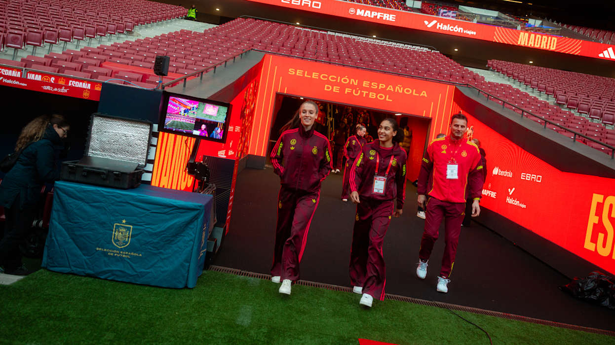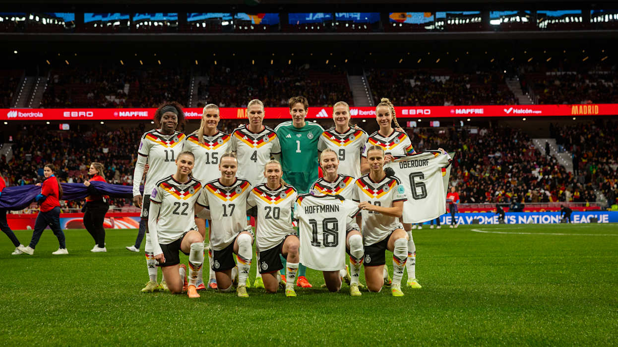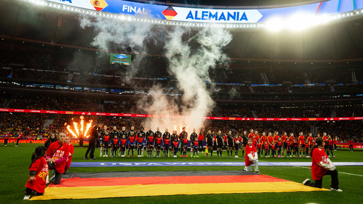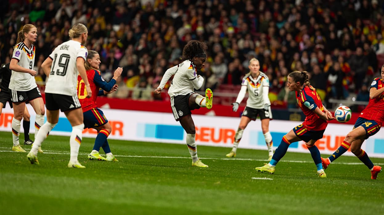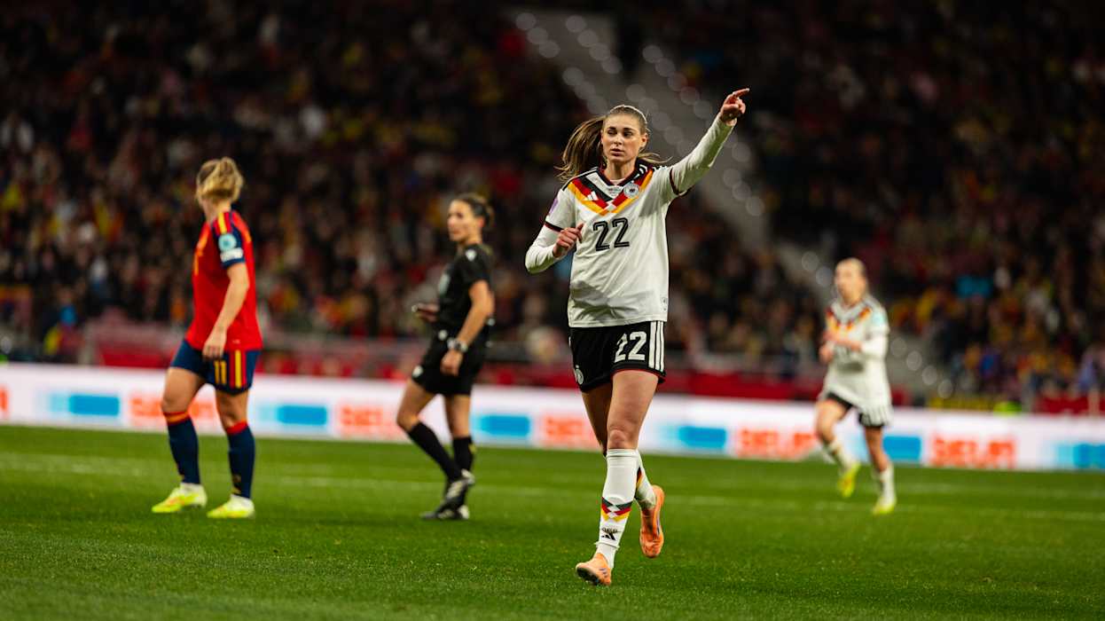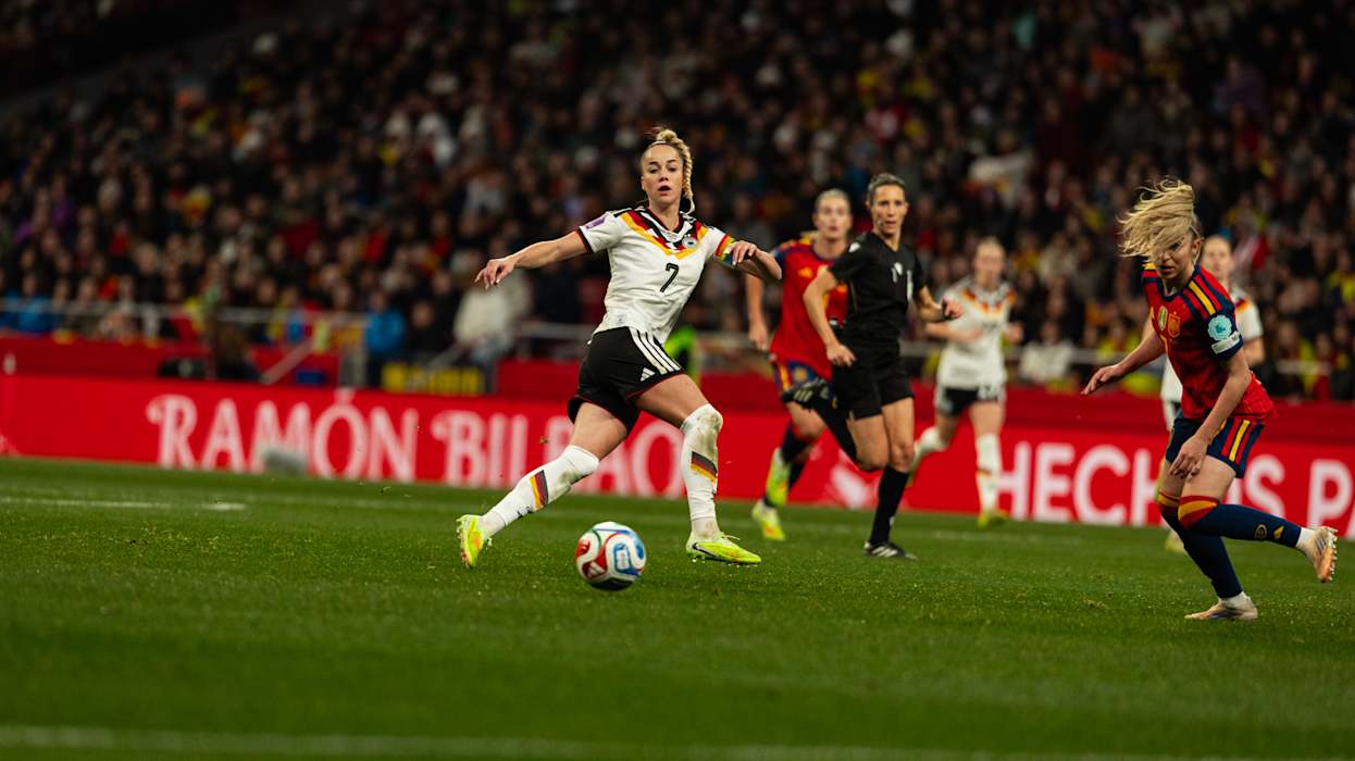 Im Estadio Metropolitano der spanischen Hauptstadt hatten die Gastgeberinnen vor 55.843 Zuschauer*innen zunächst mehr Ballbesitz, die deutsche Elf war aber giftig in den Zweikämpfen. Trotzdem hatten die Gastgeberinnen nach feinem Zusammenspiel durch Esther Gonzalez' Flachschuss (4.) und den Kopfball von Alexia Putellas (6.) gleich zwei Großchancen.