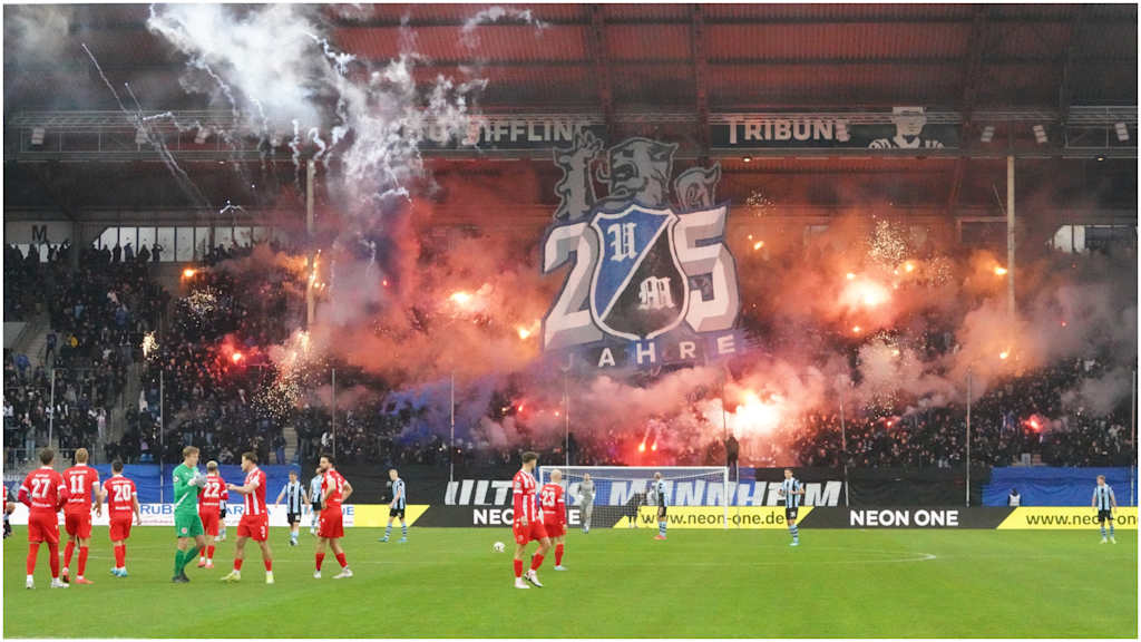 Unmittelbar vor dem Drittligaspiel gegen den FC Energie Cottbus am 7. Dezember 2024 zündeten Mannheimer Zuschauer 50 Bengalische Fackeln, sechs Rauchkörper und zwölf Fontänen. Zudem schossen sie zahlreiche pyrotechnische Gegenstände aus vier Batterien ab und warfen beziehungsweise schossen darüber hinaus 25 Knallkörper in Richtung Spielfeld. Dadurch verzögerte sich der Anstoß um etwa zwei Minuten. Während der Partie brannten die Heimzuschauer anschließend weitere 121 Bengalische Fackeln ab.