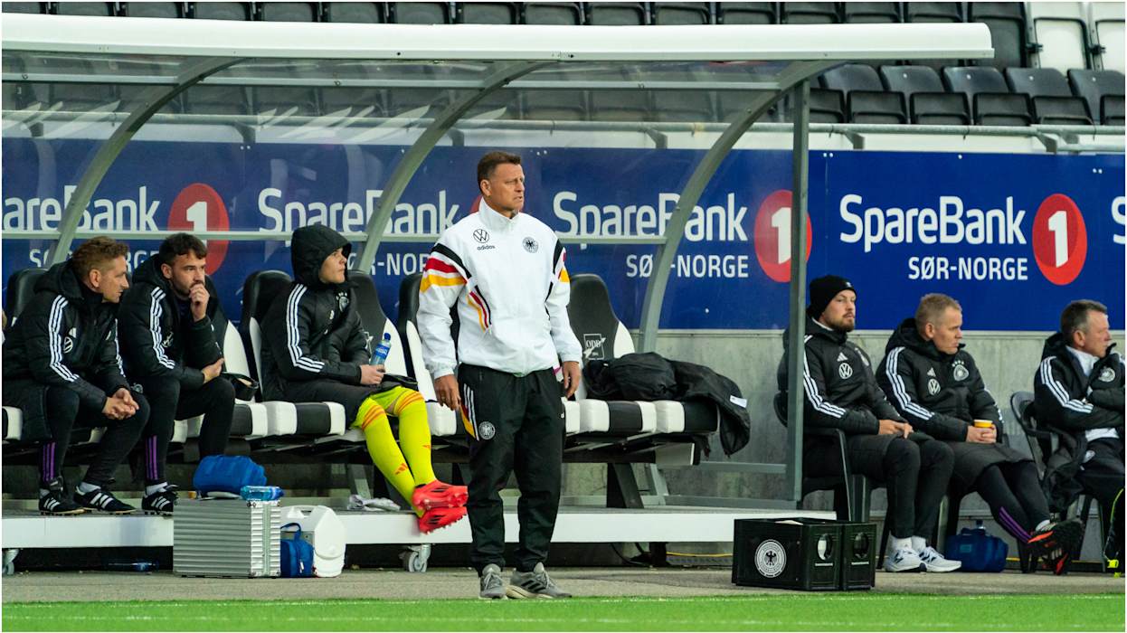 Die DFB-Auswahl startete gut in das Spiel und kam in der 5. Minute zum ersten guten Abschluss: Einen abgefälschten Schuss von Moritz Reimers lenkte Norwegens Torhüter Mathias Klausen um den linken Pfosten. Fünf Minuten später zappelte der Ball zum ersten Mal im Netz. Doch Gaul Souza stand beim Zuspiel von Francis Onyeka knapp im Abseits (11.). Die DFB-Auswahl blieb auch in der Folge dominant, presste hoch und kam immer wieder zu Abschlussmöglichkeiten: Souza´s Abschluss nach schönem Angriff über die linke Seite war zu zentral (14.), ein Freistoß von Francis Onyeka aus rechter Position ging knapp am linken Pfosten vorbei (20.).