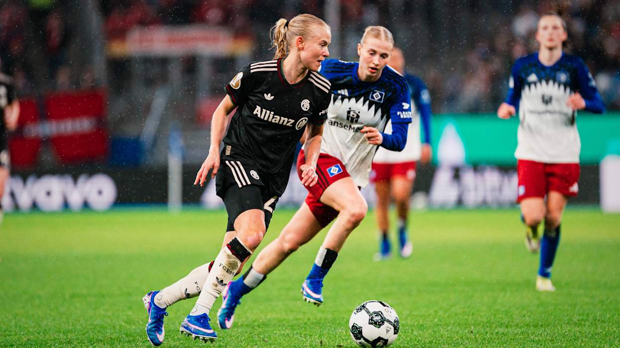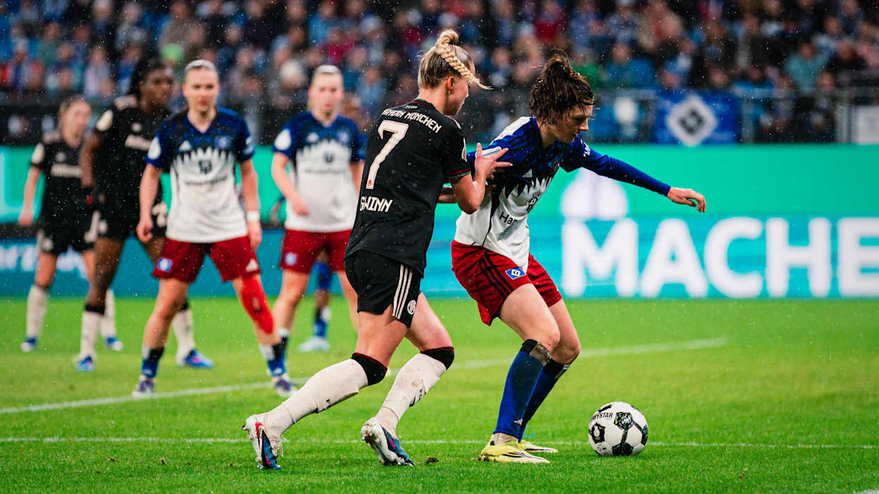Der FC Bayern München war im Duell mit dem Hamburger SV von Beginn an tonangebend und schnürte die Gastgeberinnen in ihre Hälfte ein. Die erste echte Chance nutzte der FC Bayern München zur Führung. Nach einer Kombination auf der rechten Seite flankte Giulia Gwinn halbhoch, Hamburgs Torfrau Lea Paulick griff daneben und Edna Imade musste so aus kurzer Distanz nur noch einköpfen (6.). Danach zogen sich die Münchnerinnen zurück, sorgten aber durch Linda Dallmann (9.) und Barbara Dunst (33.) für Gefahr. Mit der knappen Führung für die Gäste ging es in die Pause.