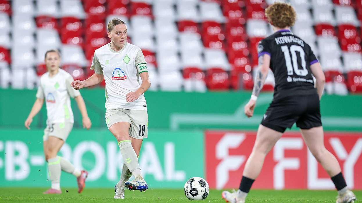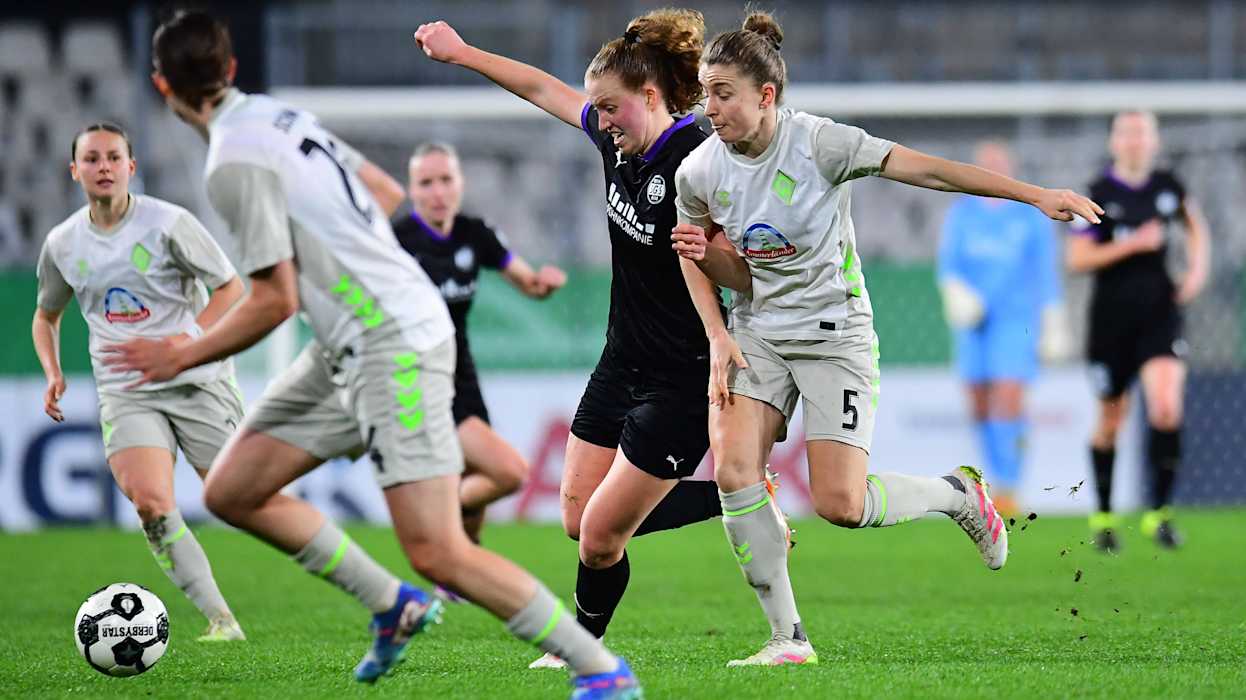 Das Duell der beiden Bundesligisten SGS Essen und SV Werder Bremen hielt, was es versprach. Der Vorjahresfinalist Bremen hatte in der ersten Halbzeit mehr vom Ball, SGS-Torhüterin Luisa Palmen verhinderte aber die Führung für die Gäste durch eine Parade gegen Mara Alber (35.). Essen blieb trotz wenig Ballbesitz durch ihr Umschaltspiel immer gefährlich. Gegen Ende der ersten Hälfte bauten die Essenerinnen immer mehr Druck auf und gingen durch Ella Touon in Führung (43.).