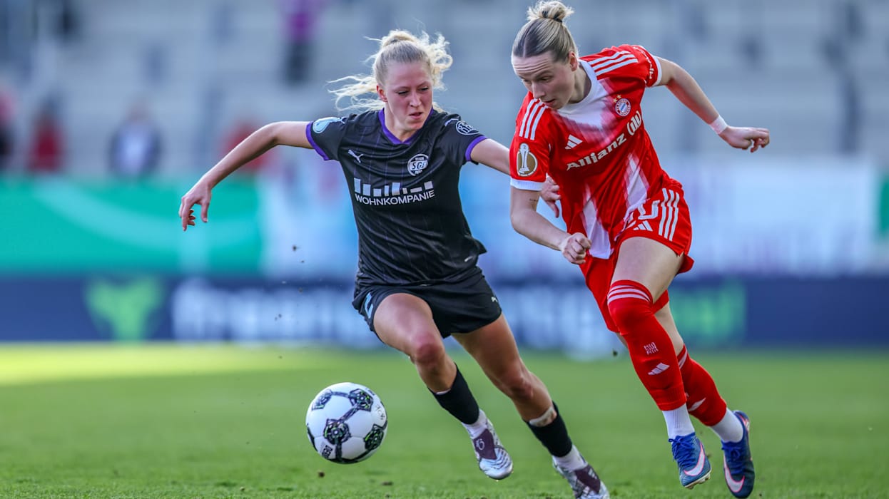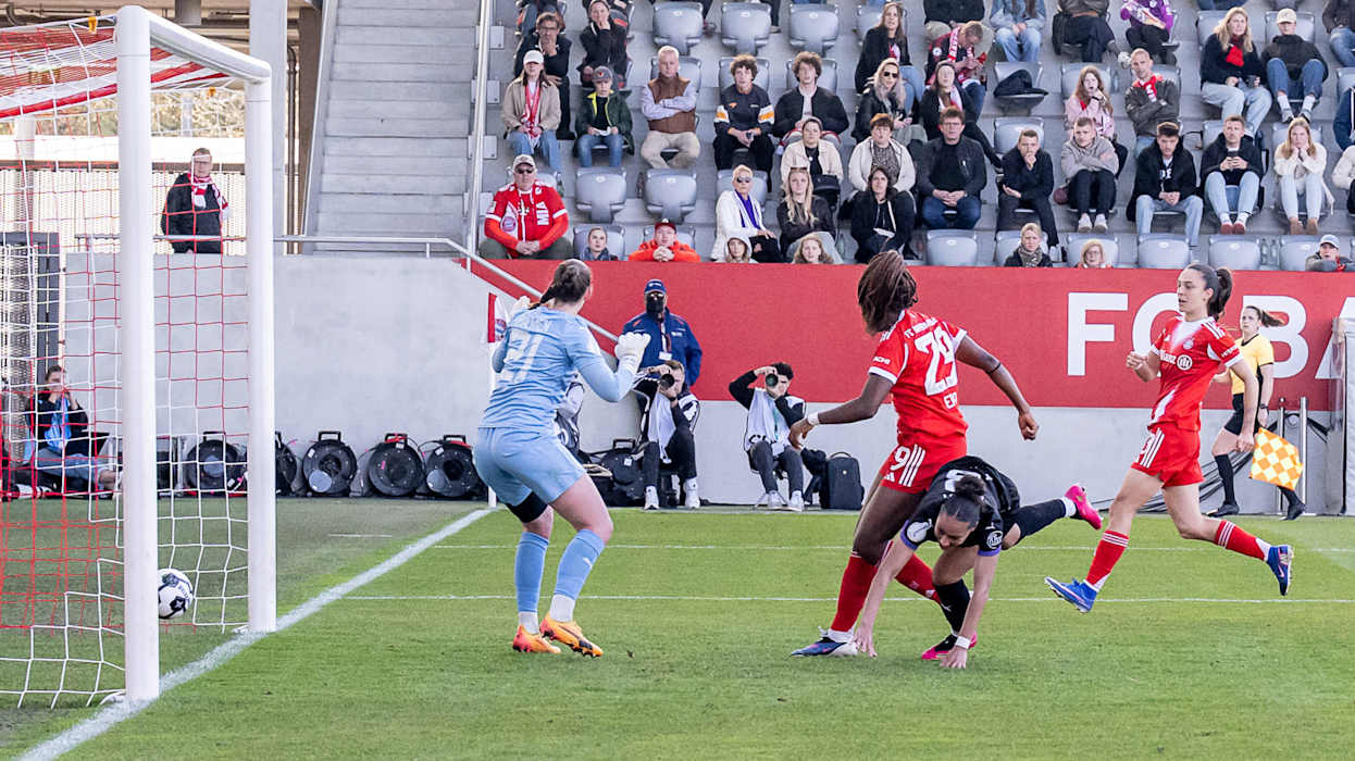 Die Münchnerinnen starteten gut in die Partie und erspielten sich rasch die erste Chance: Ein von Giulia Gwinn mit viel Effet in den Strafraum geschlagener Freistoß ging nur knapp an allen Köpfen vorbei und landete schließlich in den Armen von SGS-Torhüterin Luisa Palmen (2.). Doch auch Essen hatte eine frühe Torschussgelegenheit. Ein Steilpass landete im Lauf von Ella Touon. Torhüterin Ena Mahmutovic kam aus dem Tor und schoss den Ball weg, bevor die Essener Stürmerin ihn erreichte (4.). In der Folge hatte Bayern zwar viel Ballbesitz, tat sich aber schwer, Chancen herauszuspielen. So dauerte es bis zur 17. Minute, bis Edna Imade auf der rechten Seite in den Strafraum kam und abzog. Ihr Schuss wurde von der Essener Hintermannschaft zur Ecke geblockt.