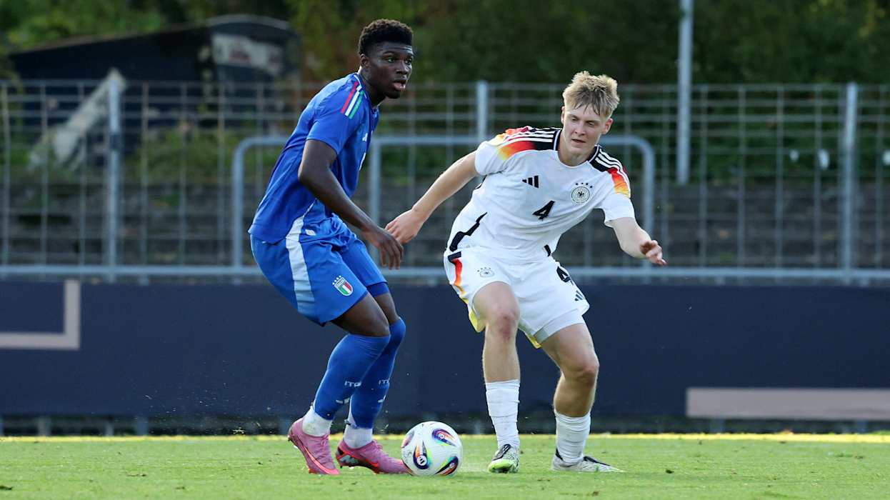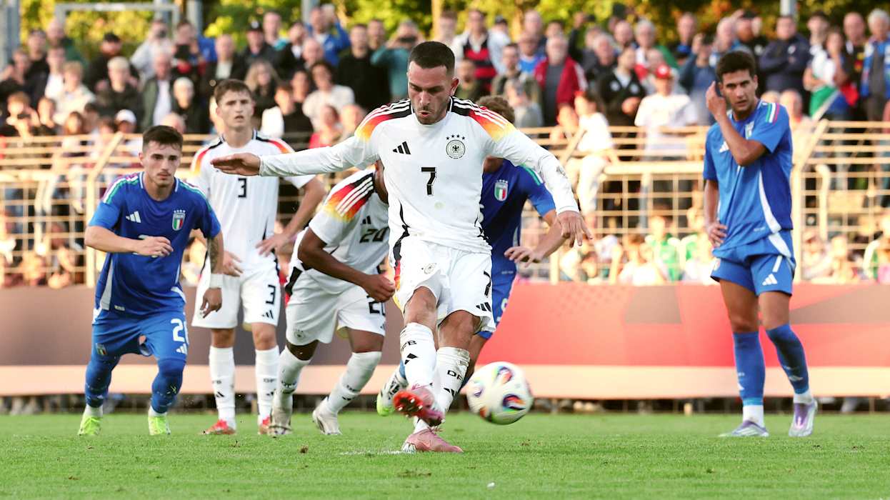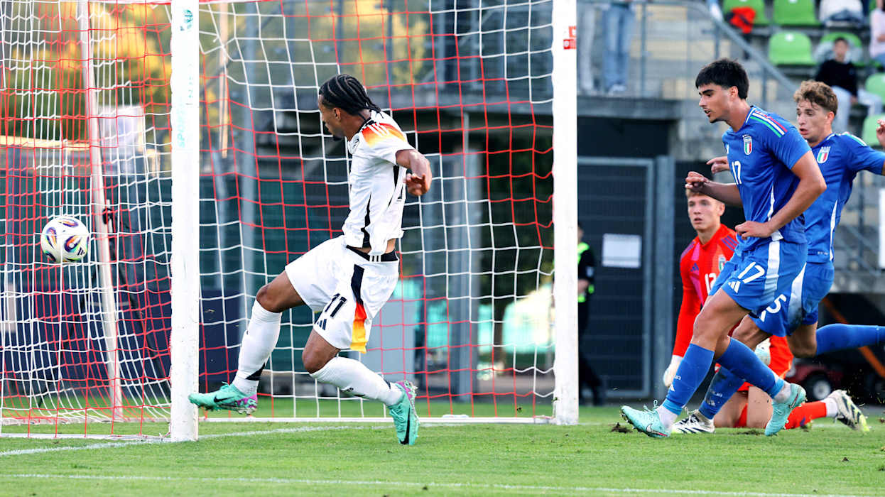 Das DFB-Team brauchte vor 6700 Fans einige Minuten, um sich an das aggressive Pressing der Italiener zu gewöhnen. Doch spätestens nach einem Lattenkracher von Laurin Ulrich (5.) waren die Gastgeber voll im Spiel und fortan dominant. Landete ein Schuss aus der zweiten Reihe von Eric da Silva Moreira noch in den Armen von Schlussmann Jacopo Seghetti (7.), traf Ouedraogo sieben Minuten später umso sehenswerter, als er eine flache Hereinhabe von Maurice Krattenmacher mit der Hacke aus etwa neun Metern ins lange Eck abtropfen ließ.
