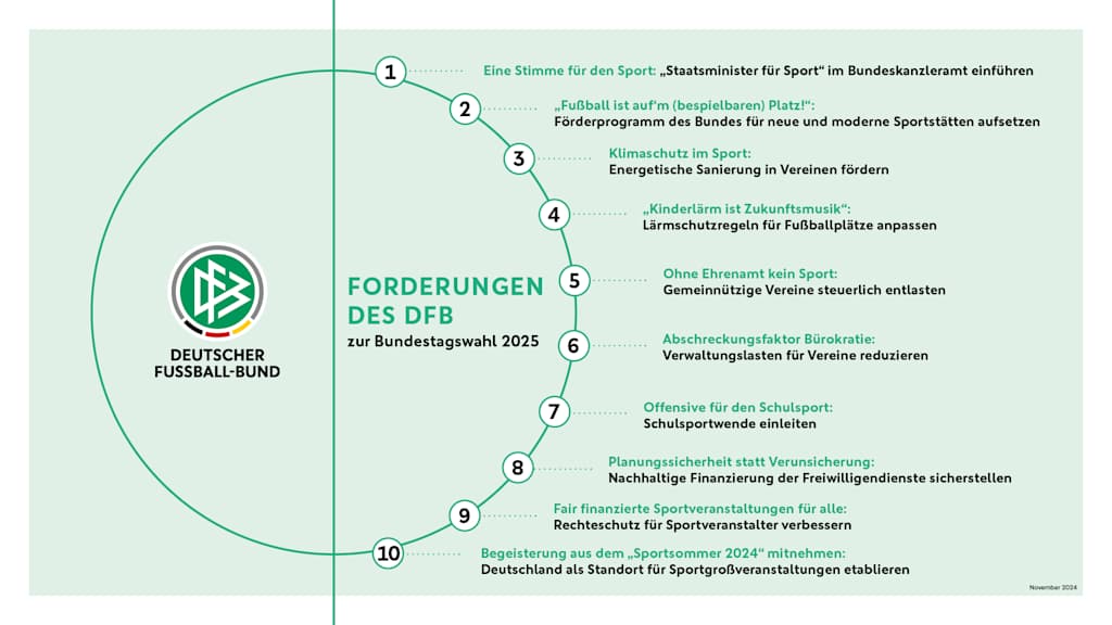 Anlässlich der Bundestagswahl 2025, die am Sonntag, 23. Februar, stattfindet, hat der DFB zehn zentrale Forderungen für den deutschen Fußball formuliert: