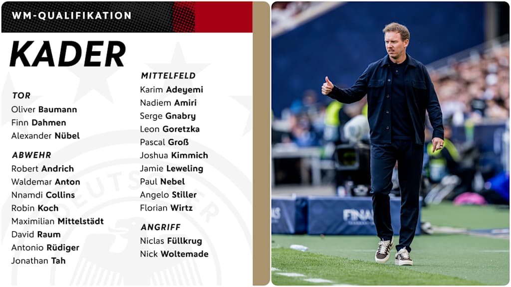 Bundestrainer Julian Nagelsmann hat am heutigen Mittwoch im Rahmen einer Pressekonferenz am DFB-Campus in Frankfurt sein Aufgebot für den Start in die WM-Qualifikation bekanntgegeben. Mit den beiden Spielen gegen die Slowakei und Nordirland beginnt für die deutsche Nationalmannschaft in der nächsten Woche der Weg zur Weltmeisterschaft im kommenden Jahr in den USA, Kanada und Mexiko.