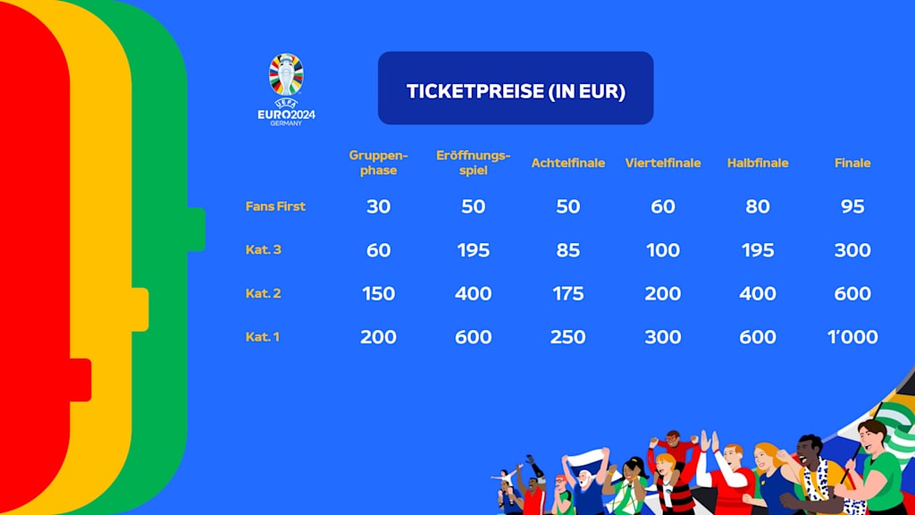 Die UEFA hat ein Eintrittskarten-Programm entwickelt, bei dem die Fans weiterhin Priorität haben. Mehr als 80 Prozent der insgesamt 2,7 Millionen Tickets stehen den Fans der teilnehmenden Mannschaften und der breiten Öffentlichkeit zur Verfügung. Die günstigsten Tickets kosten 30 Euro, und eine Million Tickets sind für weniger als 60 Euro erhältlich.