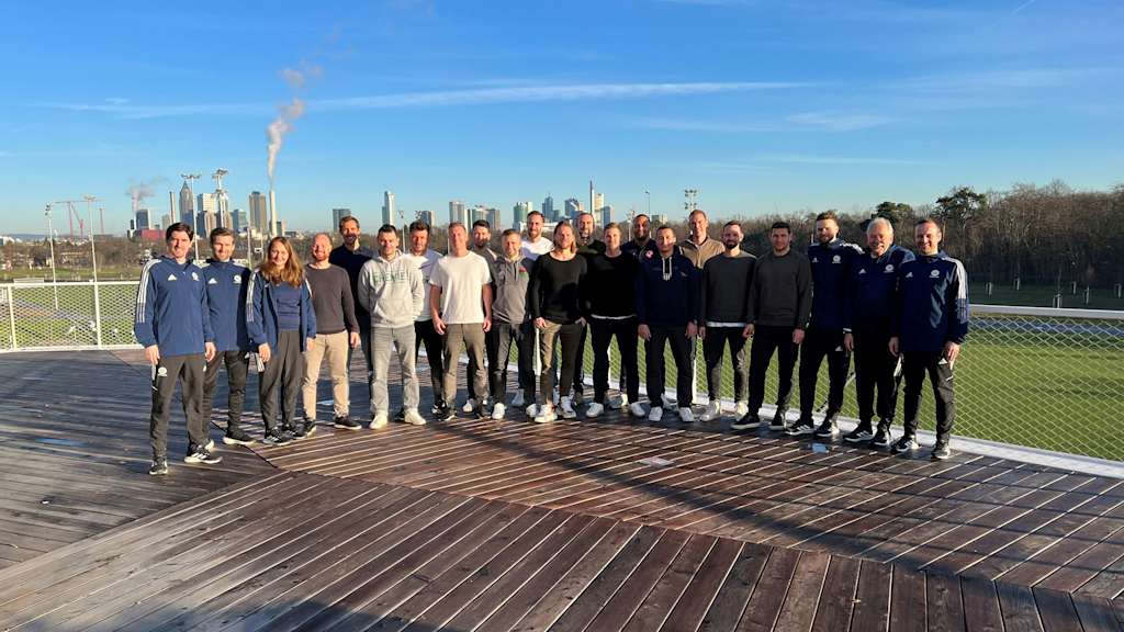 16 Trainer haben am Montag die Pro-Lizenz-Ausbildung für die höchste Trainer*innen-Lizenz im deutschen Fußball begonnen. Es ist der erste Jahrgang, der die Infrastruktur des DFB-Campus' in Frankfurt am Main von Kursbeginn an für die Arbeit in kleinen Gruppen nutzen kann. Neben den Rasenplätzen draußen stehen den Teilnehmer*innen auch ein Indoor-Kunstrasenplatz sowie moderne Seminarräume zur Verfügung. Ideale Bedingungen für das Ausbildungsteam, um die Gruppe anhand von vier Themenschwerpunkten für die Arbeit im Profifußball vorzubereiten.