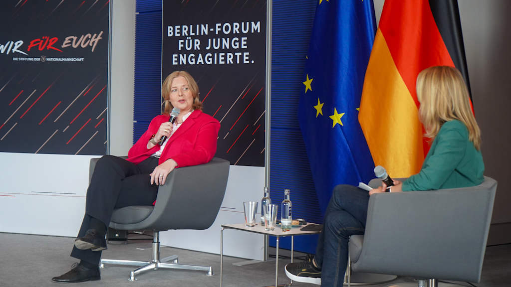 Der Besuch von Bundestagspräsidentin Bärbel Bas war ein besonderes Highlight des Berlin-Forums für junge Engagierte, das die Stiftung der Nationalmannschaft derzeit gemeinsam mit der Deutschen Stiftung für Engagement und Ehrenamt (DSEE) in Berlin realisiert. Gleich zu Beginn der einstündigen Gesprächsrunde mit 30 jungen Menschen, die sich ehrenamtlich im Sport und anderen gesellschaftlichen Bereichen engagieren, berichtete die Politikerin schmunzelnd von ihrer aktiven Fußballzeit in Duisburg: "Dabei durfte ich auch zweimal in der ersten Mannschaft mit der damaligen Spielerin Martina Voss-Tecklenburg aushelfen."