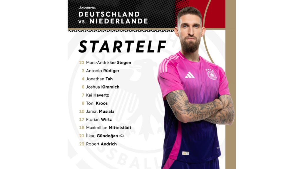 Die Startelf: 22 ter Stegen - 2 Rüdiger, 4 Tah, 6 Kimmich, 7 Havertz, 8 Kroos, 10 Musiala, 17 Wirtz, 18 Mittelstädt, 21 Gündogan (C), 23 Andrich.