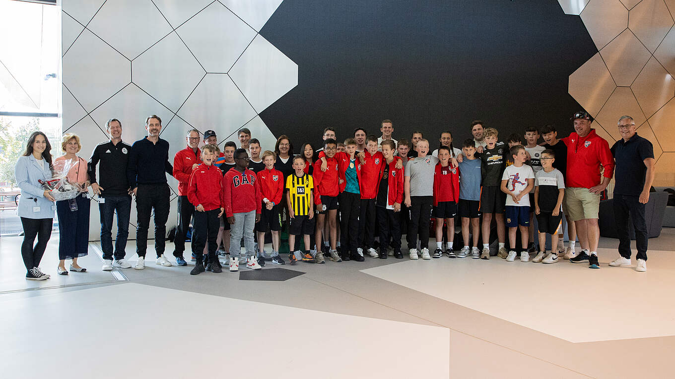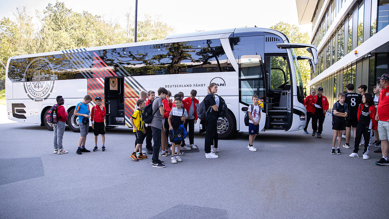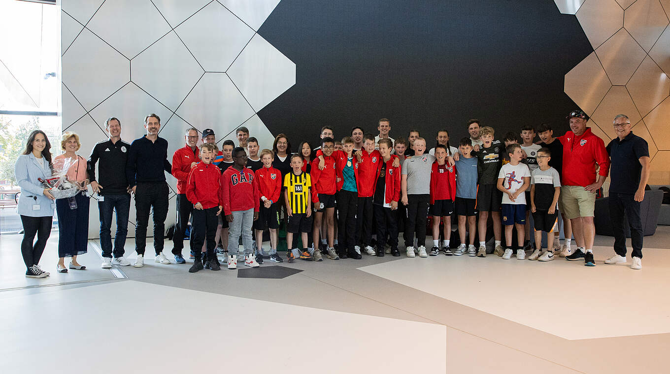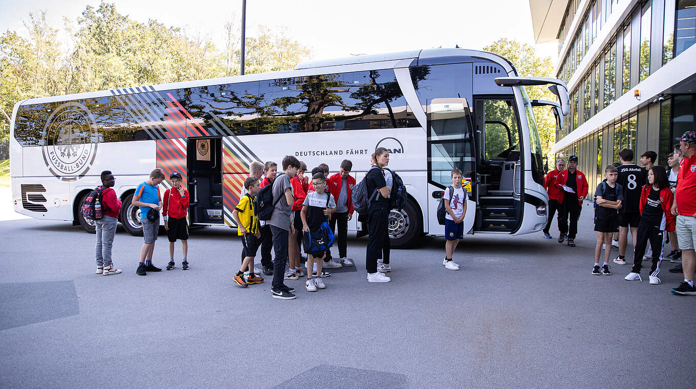 Spieler und Trainer wurden vom offiziellen DFB-Mannschaftsbus vor Ort abgeholt und nach Frankfurt gebracht. Angekommen begann der Tag mit einer Campus-Führung. Im Zuge dessen ließen es sich Generealsekretärin Heike Ullrich und Direktor Rudi Völler nicht nehmen, den Verein offiziell seitens des DFB zu begrüßen.