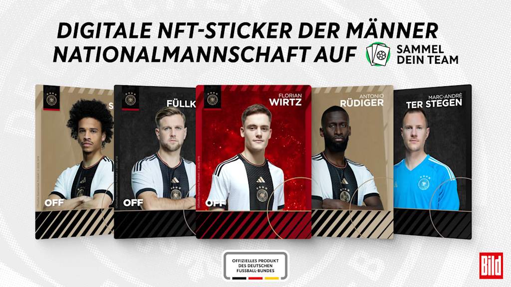 Der Deutsche Fußball-Bund (DFB) hat die Lizenz für digitale NFT-Collectibles der Männer-Nationalmannschaft bis einschließlich der Europameisterschaft 2024 in Deutschland an Axel Springer vergeben. Ab sofort haben alle Fußballfans die Möglichkeit, digitale NFT-Sticker der Nationalspieler auf der Online-Plattform "www.sammeldeinteam.de" zu sammeln. Die virtuellen Produkte werden dabei überwiegend über die BILD-Gruppe, transfermarkt.de und TorAlarm beworben und vertrieben.
