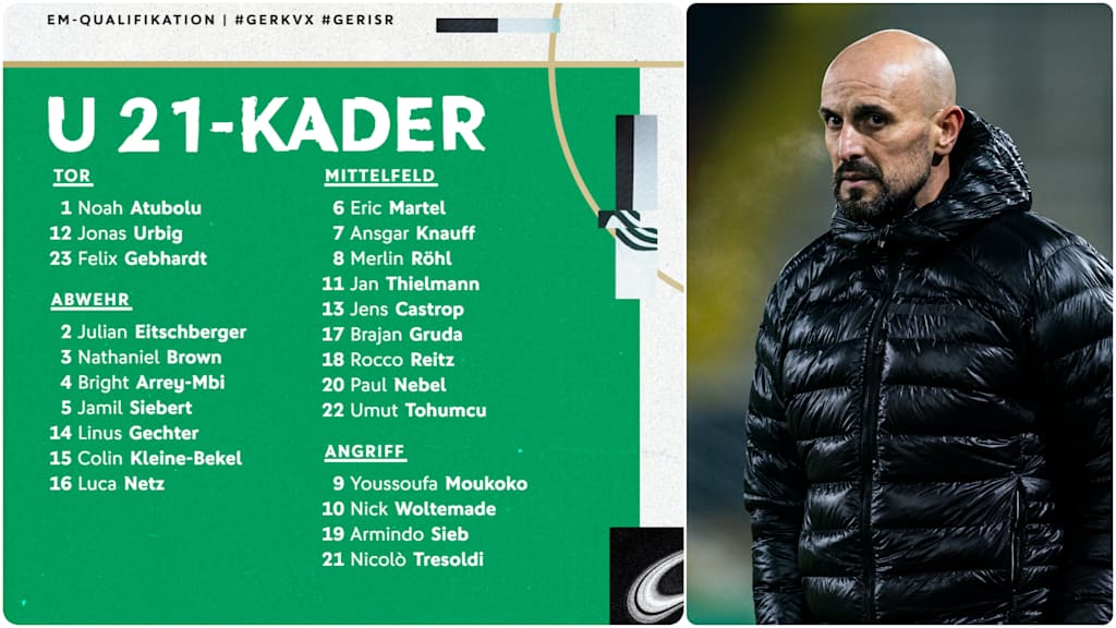 Verzichten muss der DFB-Trainer dagegen auf Maximilian Beier (TSG Hoffenheim), zuletzt Stammkraft in der deutschen U 21, der von Bundestrainer Julian Nagelsmann für den Kader der A-Nationalmannschaft nominiert worden ist. "Diese Berufung freut mich sehr für Maxi", sagt Di Salvo. "Er spielt eine tolle Saison, zeigt im Verein Topleistungen und hat sich zuvor auch bei uns in der U 21 richtig gut präsentiert. Für ihn und seinen Verein ist die Nominierung eine besondere Auszeichnung, und wir freuen uns natürlich auch, wenn einem Spieler über die U 21 der Sprung in die A-Nationalmannschaft gelingt."