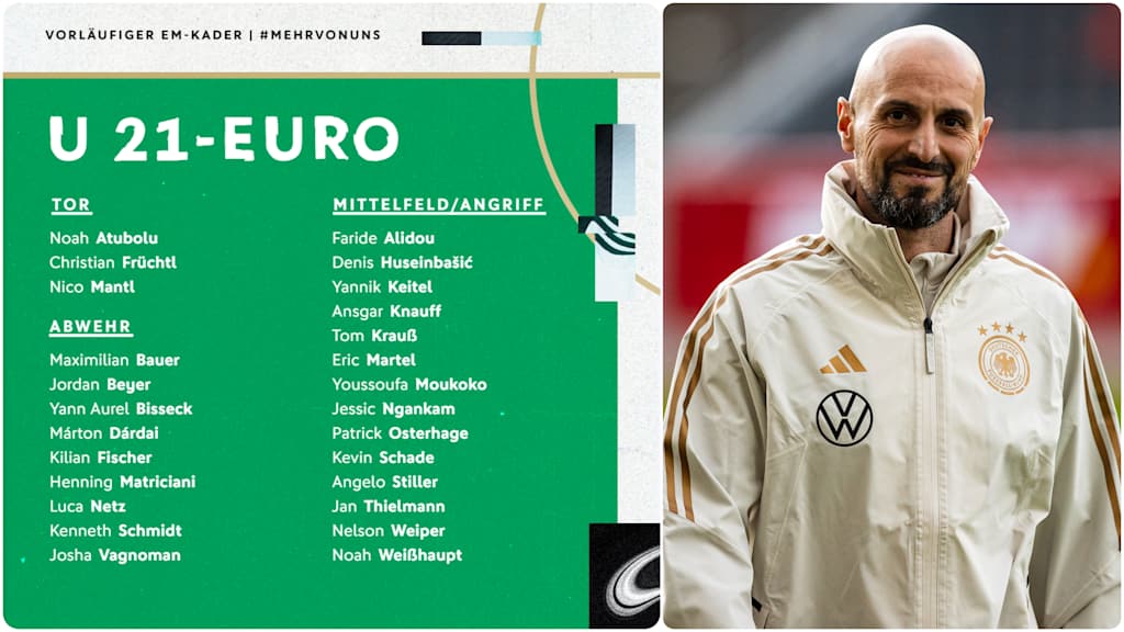 Kevin Schade (FC Brentford) wird zunächst dem Kader der A-Nationalmannschaft angehören und nach der Partie gegen die Ukraine am 12. Juni (ab 18 Uhr, live im ZDF) in Richtung Südtirol reisen. Mit Youssoufa Moukoko (Borussia Dortmund) und Josha Vagnoman (VfB Stuttgart) kehren zudem zwei weitere Spieler, die zuletzt für die Mannschaft von Hansi Flick aufliefen, in den Kreis der U 21 zurück. "Wir sind froh, die drei Jungs als wichtige Säulen für die EM zurück im Team zu haben", sagt Di Salvo. "Die Heim-EM 2024 und die Vorbereitung darauf hat für den gesamten DFB eine sehr hohe Priorität, dementsprechend haben Hansi und ich uns vor dieser Nominierung besonders intensiv ausgetauscht."