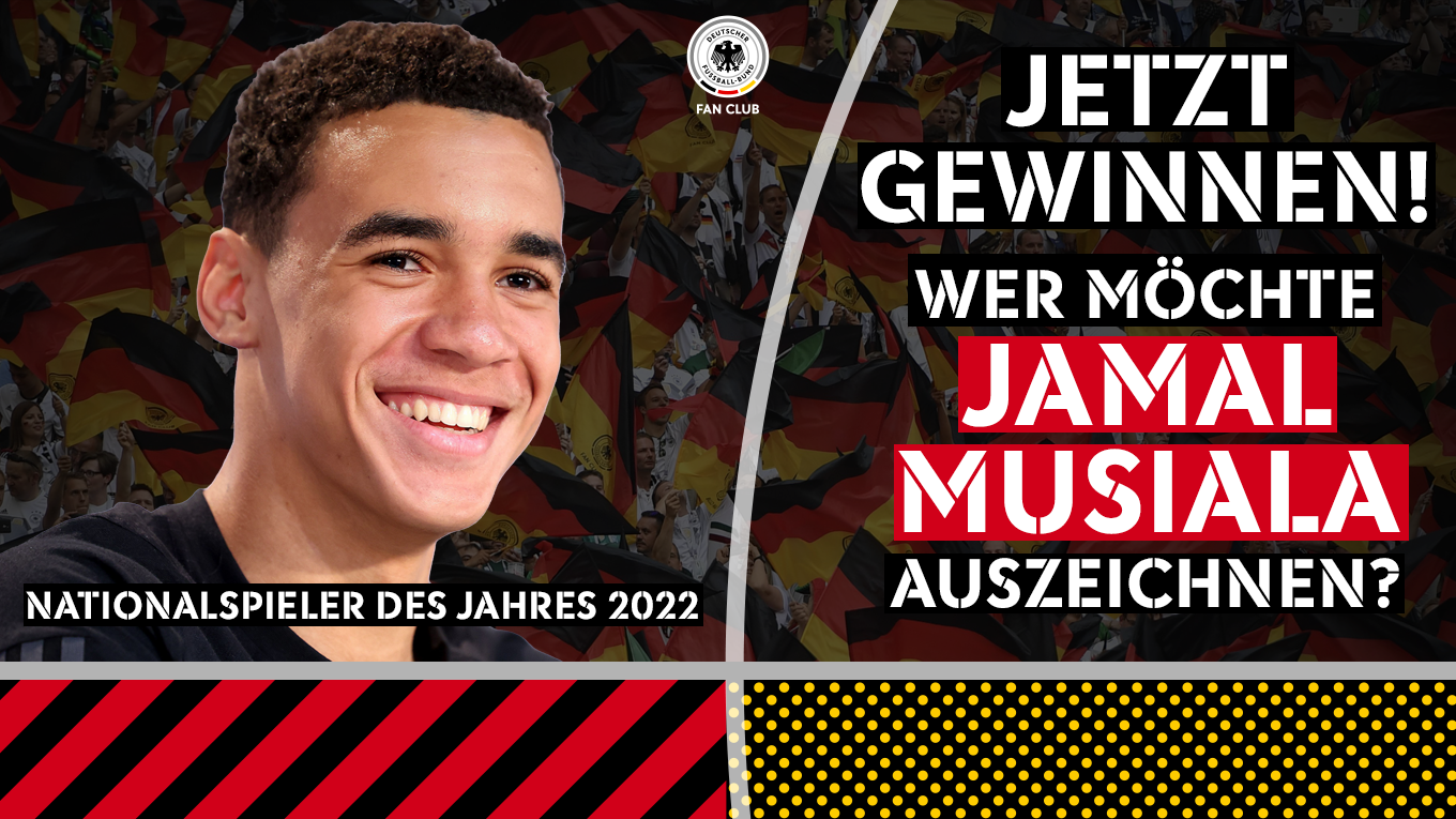 Auch wenn das Länderspieljahr 2022 für unsere Nationalmannschaft ernüchternd endete, zählt Jamal Musiala zu den Lichtblicken im DFB-Team. Das belohnten die Fans bei der Wahl zum Nationalspieler des Jahres mit 66,3 Prozent aller Stimmen. Beim Peru-Länderspiel in Mainz am 25. März (ab 20.45 Uhr, live im ZDF) soll der Youngster seine Auszeichnung erhalten. Und das mit etwas Glück von dir! Denn der Fan Club Nationalmannschaft verlost exklusiv unter seinen Mitgliedern einen Fan-tastic Moment rund um das Länderspiel in Mainz.