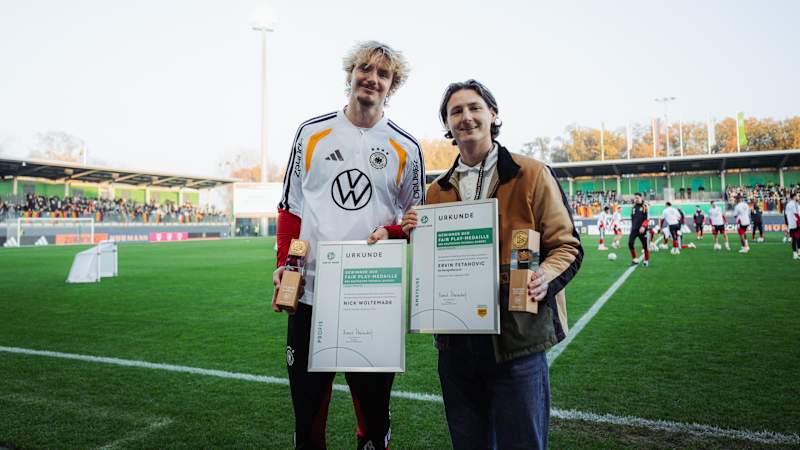 Nationalspieler Nick Woltemade und Ervin Fetahovic, Coach der C-Junioren der SG Markgräflerland, sind die Fairsten der Saison 2024/2025. Der DFB zeichnete sie heute beim öffentlichen Training in Wolfsburg mit der Fair-Play-Medaille aus.