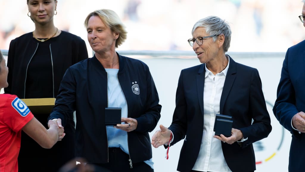 Die Ehrungsdelegation für das Endspiel bilden DFB-Präsident Bernd Neuendorf, DFB-Vizepräsidentin Sabine Mammitzsch, DFB-Generalsekretärin Heike Ullrich und Bundestrainerin Martina Voss-Tecklenburg. Die Trophäe wird der Siegerkapitänin von Sabine Mammitzsch überreicht.