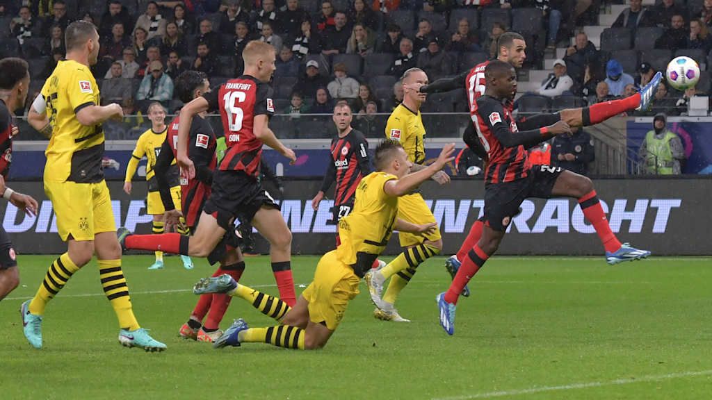 Nach einem abgewehrten Torschuss der Frankfurter will der Dortmunder Verteidiger Marius Wolf den Ball mit dem rechten Fuß aus dem Strafraum schlagen. Als er dazu ausholt, hat er den linken Arm weit abgespreizt. Bevor Wolf den Ball spielt, spitzelt der Frankfurter Ansgar Knauff ihn aus kurzer Distanz an diesen abgespreizten Arm. Der Schiedsrichter lässt zunächst weiterspielen, doch auf Empfehlung des Video-Assistenten kommt es zu einem On-Field-Review. Danach entscheidet der Unparteiische auf Strafstoß.