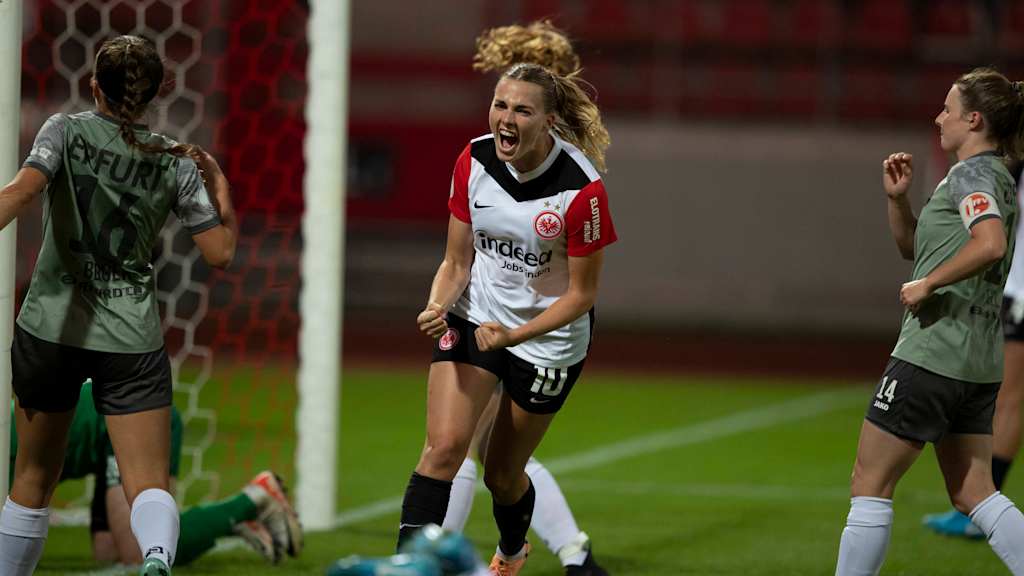 Lange mussten die 1753 Zusehenden nicht auf den ersten Treffer warten. Bereits nach acht Minuten versenkte Remina Chiba, nach Hackenvorlage von Laura Freigang, den Ball zur Gästeführung. Chiba revanchierte sich prompt, Freigang (22.) legte zum 2:0 aus Frankfurter Sicht nach. Sechs Minuten später lag das Leder erneut im Erfurter Netz, weil Geraldine Reutelers Schuss ihr Ziel traf. Auch nach der Pause war die Eintracht noch nicht satt und erhöhte durch Lisanne Gräwe (50.), Freigang (55., 56.) und Nicole Anyomi (59.) nach einer gespielten Stunde auf 7:0. Kurz vor Schluss steuerten Barbara Dunst (85.), Carlotta Wamser (88.) und wieder Reuteler (89.) noch die Tore zum Endstand bei.