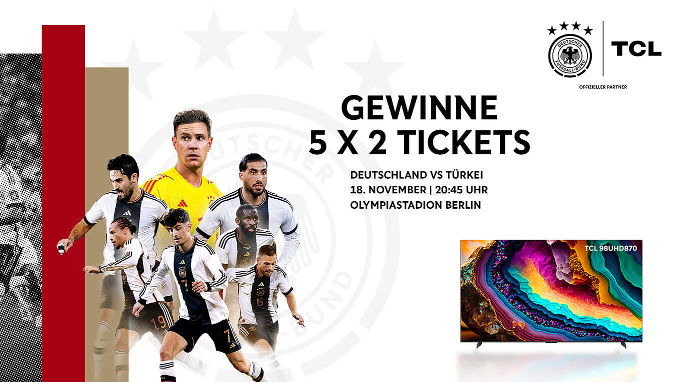 Am 18. November (ab 20.45, live bei RTL) ist es soweit: Die deutsche Nationalmannschaft trifft im Olympiastadium in Berlin auf die Türkei - und du hast die Chance, hautnah dabei zu sein. Gemeinsam mit unserem neuen Partner TCL verlosen wir fünfmal zwei Tickets für das Spiel.