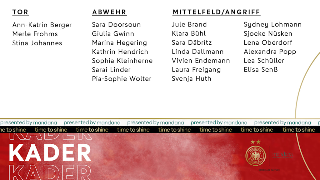 Bundestrainer Horst Hrubesch hat seinen 23 Spielerinnen umfassenden Kader für das Final Four der UEFA Women´s Nations League bekanntgegeben. Erstmals nominiert ist Vivien Endemann vom VfL Wolfsburg. Abwehrspielerin Pia-Sophie Wolter (Eintracht Frankfurt) wurde nach längerer Zeit wieder in den Kreis der Frauen-Nationalmannschaft berufen. Lena Oberdorf (VfL Wolfsburg) und Lea Schüller (FC Bayern München) kehren zurück ins DFB-Aufgebot, nachdem sie die vergangenen Nations League Spiele gegen Dänemark und Wales verletzungsbedingt verpasst hatten.