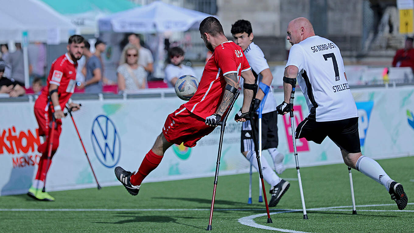 Nach dem Auftakt 2021 in Trier fanden am Wochenende die Fußball-Inklusionstage zum zweiten Mal auf dem Kölner Roncalliplatz statt. Wie schon im vergangenen Jahr trugen Fußballer*innen mit geistigen, körperlichen oder Sinnesbeeinträchtigungen unmittelbar vor dem Kölner Dom auf einem 40 mal 20 Meter großen Kunstrasenplatz ihre Spiele aus. Viele Passanten nutzten die Chance, auf den mobilen Tribünen Platz zu nehmen. "Es hat sich erneut als richtig erwiesen, mit dieser Veranstaltung ins Herz einer Metropole zu gehen. Viele Menschen haben zugeschaut und waren sichtlich begeistert. So wurden die Inklusionstage zu einer perfekten Bühne, um die herausragenden Leistungen der Sportler*innen mit Behinderung einer breiten Öffentlichkeit zu präsentieren", erklärte Ralph-Uwe Schaffert, DFB-Vizepräsident und Vorsitzender der DFB-Stiftung Sepp Herberger.