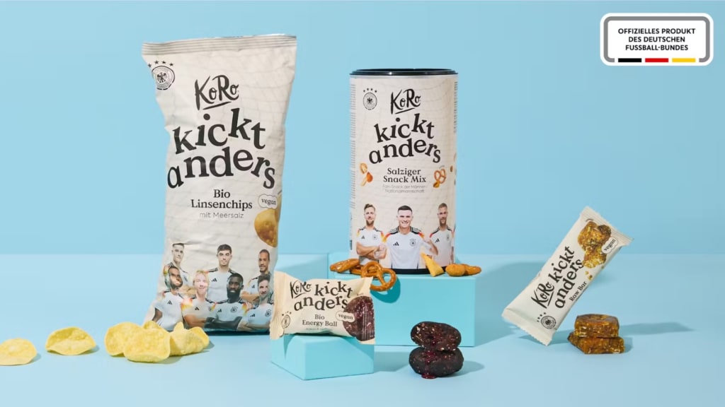 Die Lebensmittelmarke KoRo ist neuer Lizenzpartner der deutschen Männer-Nationalmannschaft in der Produktkategorie Snacks. Passend zur Heim-EM 2024 gibt es vier Snacks des Berliner Unternehmens mit offiziellem DFB-Branding. Ob beim Public Viewing, im Stadion oder zu Hause auf der Couch - für jeden Fan ist das Richtige dabei.