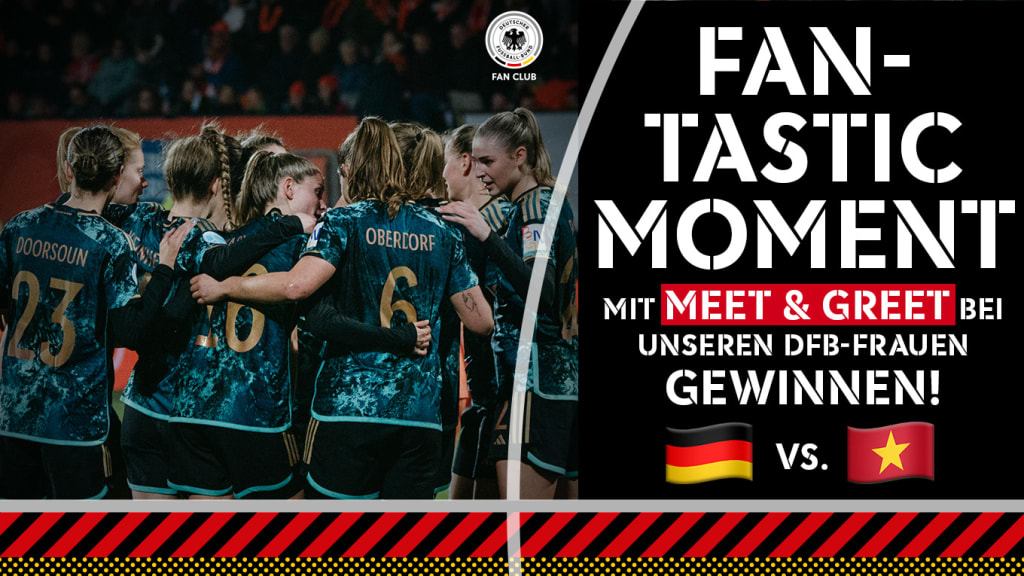 Der Länderspieltrip mit einer Begleitung deiner Wahl beginnt bereits am 23. Juni, einen Tag vor dem Spiel. Bei der Pressekonferenz in Offenbach könnt ihr direkt neben den Journalist*innen Platz nehmen. Außerdem seid ihr exklusiv beim Abschlusstraining dabei und seht die letzten Vorbereitungen unserer Mädels für die Partie gegen Vietnam. Zusätzlich wird sich eine Nationalspielerin extra Zeit nehmen für ein Meet & Greet. Die Anreise mit zwei Übernachtungen (23. - 25. Juni) zu eurem Fan-tastic Moment sowie zwei Tickets für das Spiel im Offenbacher Stadion am Bieberer Berg legt der Fan Club Nationalmannschaft noch obendrauf.