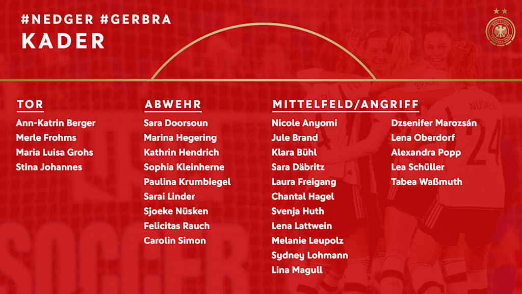 Verletzungsbedingt verzichten muss die Bundestrainerin auf Linda Dallmann (FC Bayern München/Syndesmosebandriss) und Giulia Gwinn (FC Bayern München/Reha nach Kreuzbandriss).
