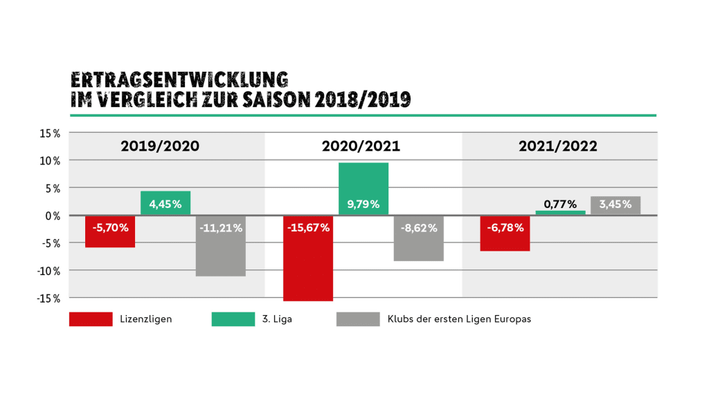 Im Vergleich zur Saison 2018/2019 musste die 3. Liga während der drei folgenden, von der Pandemie beeinflussten Spielzeiten keine Rückgänge bei den Erträgen hinnehmen. In allen drei Jahren lagen die Erträge pro Klub über dem Wert der Saison 2018/2019. Die europäischen Erstligisten und auch die deutschen Lizenzklubs hatten dagegen insbesondere in den Spielzeiten 2019/2020 und 2020/2021 deutliche Einnahmerückgänge zu verkraften.