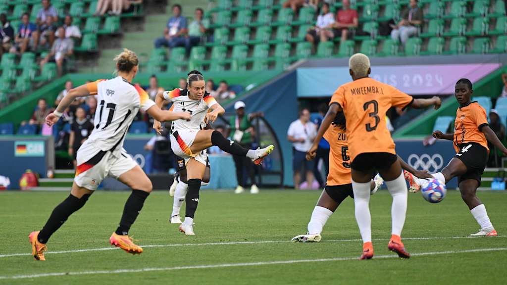 Die Frauen-Nationalmannschaft hat im dritten Spiel des Olympischen Turniers den zweiten Sieg eingefahren. Durch das 4:1 (1:0) in St. Etienne gegen Sambia steht die Mannschaft von Bundestrainer Horst Hrubesch als Gruppenzweiter hinter den USA im Viertelfinale. Dort geht es am Samstag (ab 19 Uhr) in Marseille gegen Olympiasieger Kanada. Lea Schüller traf doppelt (10., 62.), Klara Bühl kurz nach Wiederanpfiff (48.) und Elisa Senß in der Nachspielzeit (90.+7). Barbra Banda sorgte für den zwischenzeitlichen Anschlusstreffer (50.).