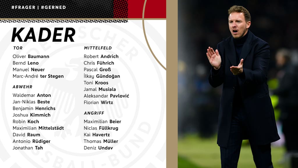 Zudem kehren die Weltmeister Toni Kroos (Real Madrid) und Manuel Neuer (FC Bayern München) sowie Chris Führich (VfB Stuttgart), Robin Koch (Eintracht Frankfurt), Bernd Leno (FC Fulham) und Jamal Musiala (FC Bayern München), die zuletzt aus unterschiedlichen Gründen im Kader der Nationalmannschaft gefehlt hatten, zurück ins DFB-Team.