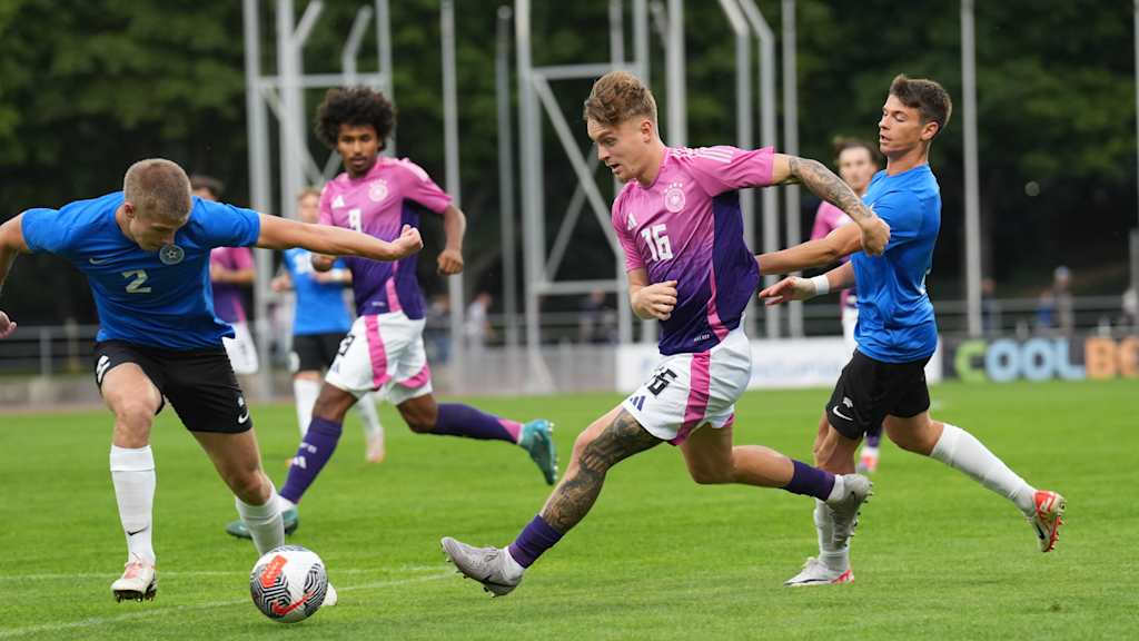 Nick Woltemade sorgte in der 23. Minute per Foulelfmeter für die Führung, Nicolò Tresoldi (30.), Karim Adeyemi (35., 44.) und Eric Martel (39.) erhöhten. Nach dem Seitenwechsel legten Woldemade (46.), Max Rosenfelder (59.), erneut Adeyemi (61.) sowie Tim Lemperle (87.) und Ansgar Knauff (90.) nach. Aleksandr Sapovalov besorgte Estlands Anschlusstor (69.).
