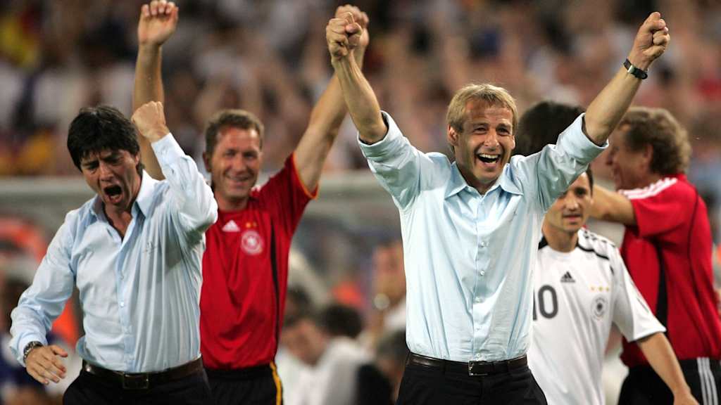 Dass er am geheiligten Schwarz-Weiß-Dress rüttelt und plötzlich auch in Rot spielen lässt, sorgt für Kritik. Er will damit Aggressivität ausstrahlen, lange genug sind die Deutschen in der Ära des "Rumpelfußballs“ gebückt gegangen. Klinsmann lässt sich nicht von seinem Kurs abbringen; dass der richtig zu sein scheint, lässt das junge Team um Talente wie Philipp Lahm, Bastian Schweinsteiger und Lukas Podolski schon beim Confed-Cup 2005 erhoffen. Deutschland spielt wieder mutig, offensiv, erfrischend. Klinsmann lebt den Geist vor, gibt als Ziel vor der Heim-WM den Titel aus und experimentiert dafür zum Teil abenteuerlich. Er gibt Spielern eine Chance, die selbst im eigenen Verein noch nicht gesetzt sind. Vor der WM 2006 zaubert er den Debütanten David Odonkor von Borussia Dortmund aus dem Hut, der für Klinsmanns Philosophie steht: unverbraucht, frech, unbekümmert. Odonkor schlägt ein bei der WM, die bis zum Halbfinale ein einziger Triumphzug ist. Mit der 0:2-Niederlage gegen Italien platzen die Titelträume und Klinsmann findet keine Kraft mehr im Amt zu bleiben.