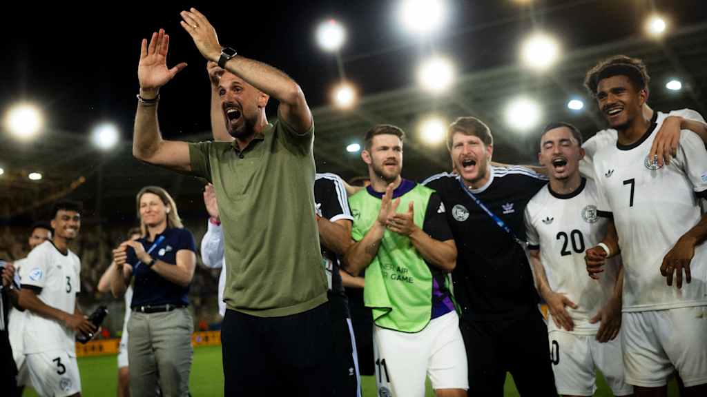 U 21-Trainer Antonio Di Salvo: Das ist unfassbar, aber so unfassbar ist es dann auch nicht, weil wir einfach eine tolle Mannschaft haben. Wir haben einen super Teamgeist. Wir haben viele Leute drumherum, die alles dafür tun, dass die Mannschaft performt. Und ich bin überglücklich, dass wir es geschafft haben. Nach dem 3:0 war es klar, dass wir das Spiel dann auch gewinnen werden. Und da kam dann schon eine Erleichterung auf. Da habe ich angefangen, den Jungs zu gratulieren. Das war ein wunderbarer Moment. Und das war ja auch immer eines unserer Ziele, so lange wie möglich dieses Gemeinschaftsgefühl zu erleben. Das war heute noch mal ein ganz großes Thema vor dem Spiel, dass wir nach Bratislava und alles daransetzen wollen, dorthin zu kommen. Jetzt sind wir in Bratislava - und jetzt wollen wir natürlich mehr.