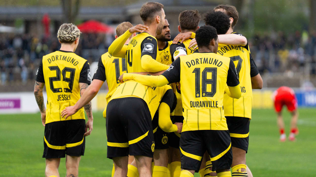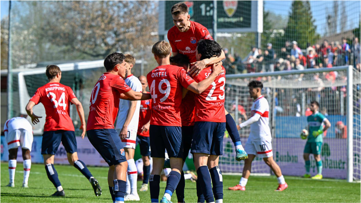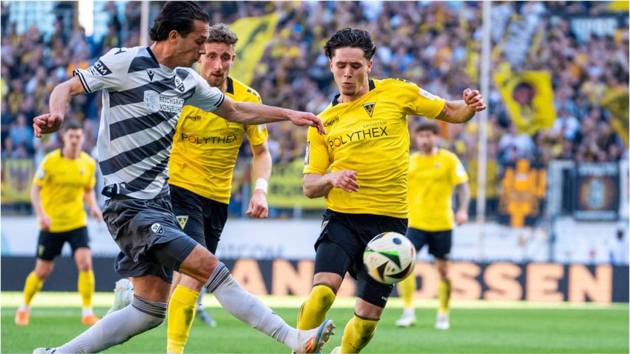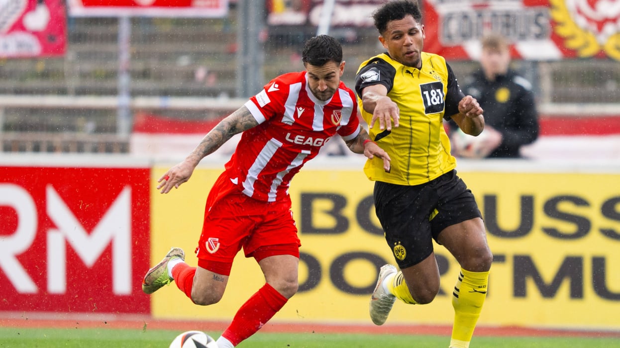 In der 3. Liga rückt Arminia Bielefeld immer näher an Spitzenreiter Dynamo Dresden heran. Die Ostwestfalen liegen dank eines 2:0 (1:0)-Auswärtssieges bei Viktoria Köln nur noch einen Zähler hinter den Nerven zeigenden Dresdnern (0:1 gegen Osnabrück). Die Reserve von Borussia Dortmund klettert weiter die Tabellenleiter empor auf den zwölften Platz und lässt Energie Cottbus durch ein 4:1 (3:0) auf Rang vier fallen. Nutznießer Saarbrücken (1:1 gegen Wehen Wiesbaden) schiebt sich somit auf den Relegationsplatz. Waldhof Mannheim hingegen hält sich nach einem 0:3 (0:1) gegen 1860 München nur noch dank des besseren Torverhältnisses oberhalb der Stuttgarter Zweitvertretung (2:2 in Unterhaching) und der Abstiegszone. DFB.de hat die Bilder des 33. Spieltags.