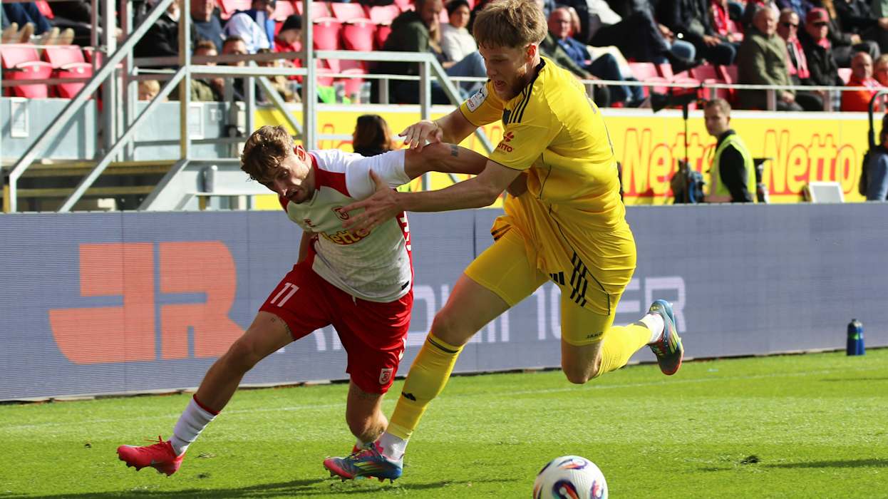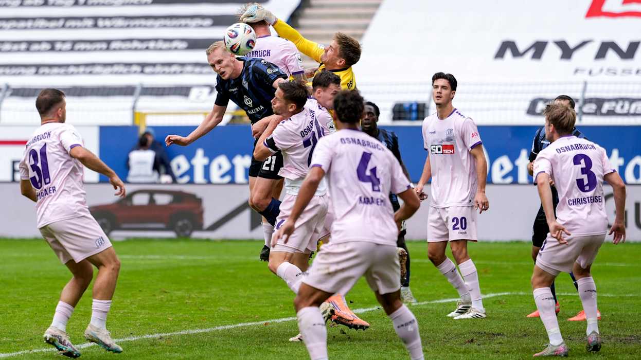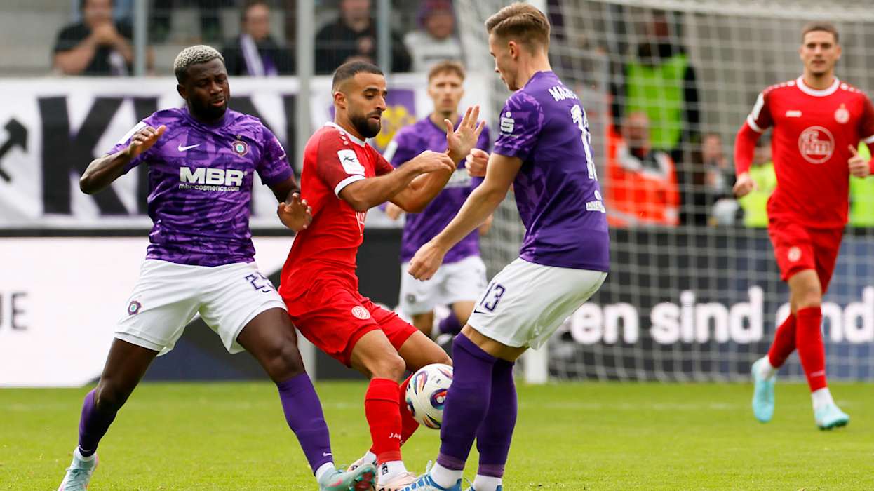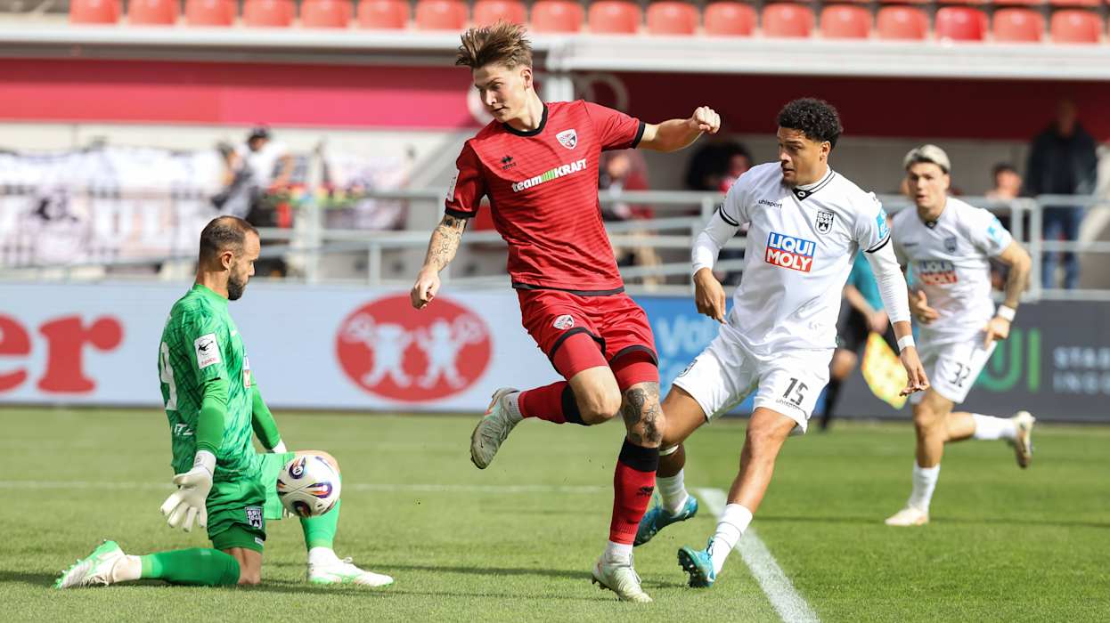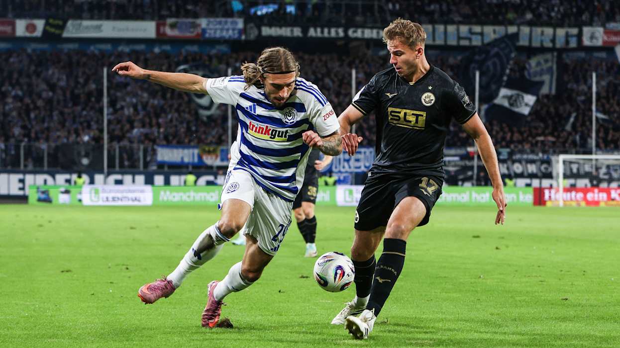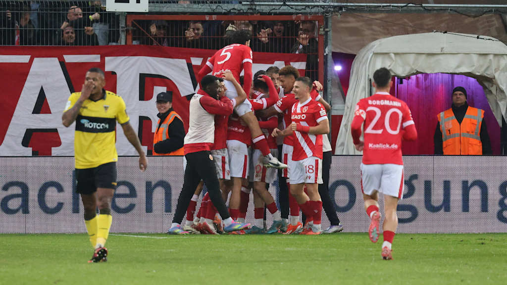 Der 10. Spieltag in der 3. Liga ist vorbei und Tabellenführer MSV Duisburg ist weiterhin ungeschlagen. Allerdings mussten die Zebras beim 2:2 (1:1) gegen Hansa Rostock erneut Punkte abgeben. Mit einem 3:2 (1:2) gegen Alemannia Aachen konnte sich Energie Cottbus auf Tabellenplatz zwei vorschieben, auf dem Relegationsplatz rangiert durch einen 4:1-Auswärtssieg in Mannheim der VfL Osnabrück. Punktgleich dahinter steht der 1. FC Saarbrücken, der beim 1:1 (0:1) in Regensburg das dritte Unentschieden in Serie hinnehmen musste. Im weiteren Verfolgerfeld sind Viktoria Köln (4:1 gegen Havelse), Wehen Wiesbaden (1:0 gegen 1860 München), Rot-Weiss Essen (2:2 in Aue) und der SC Verl (2:1 in Schweinfurt). Im Tabellenkeller konnte der FC Ingolstadt mit einem 4:1 (1:1) gegen Zweitligaabsteiger SSV Ulm einen wichtigen Befreiungsschlag landen. DFB.de zeigt die besten Bilder des Spieltags in einer Galerie.