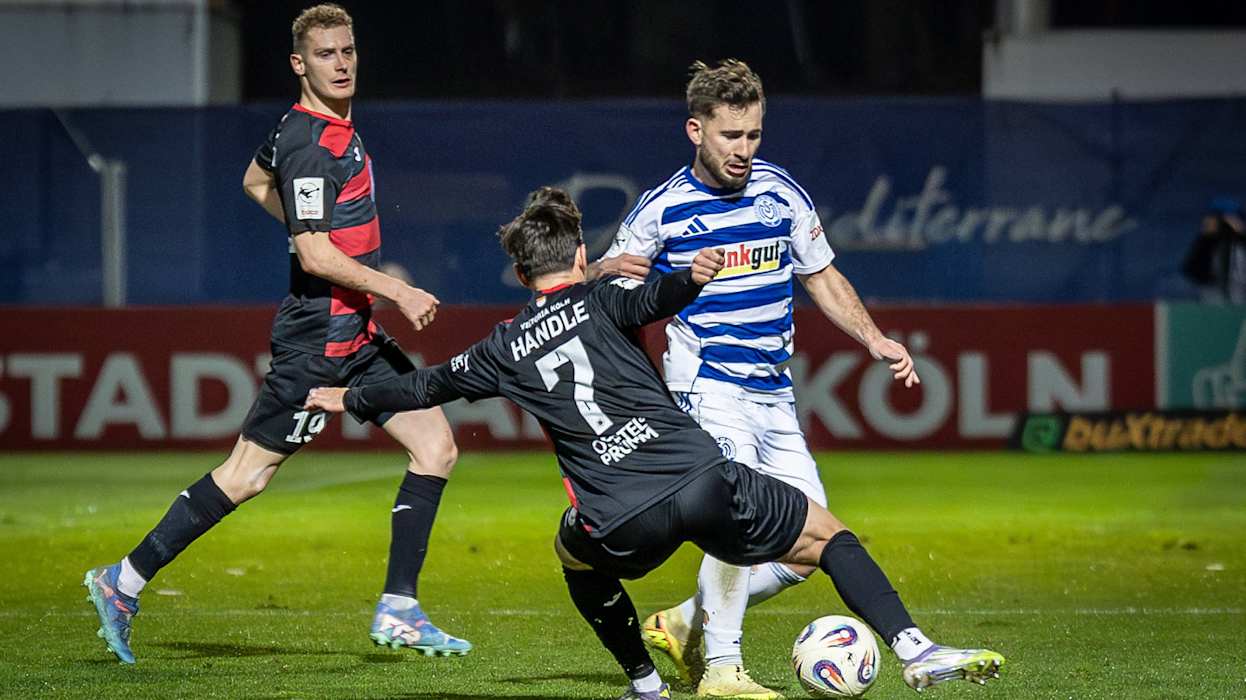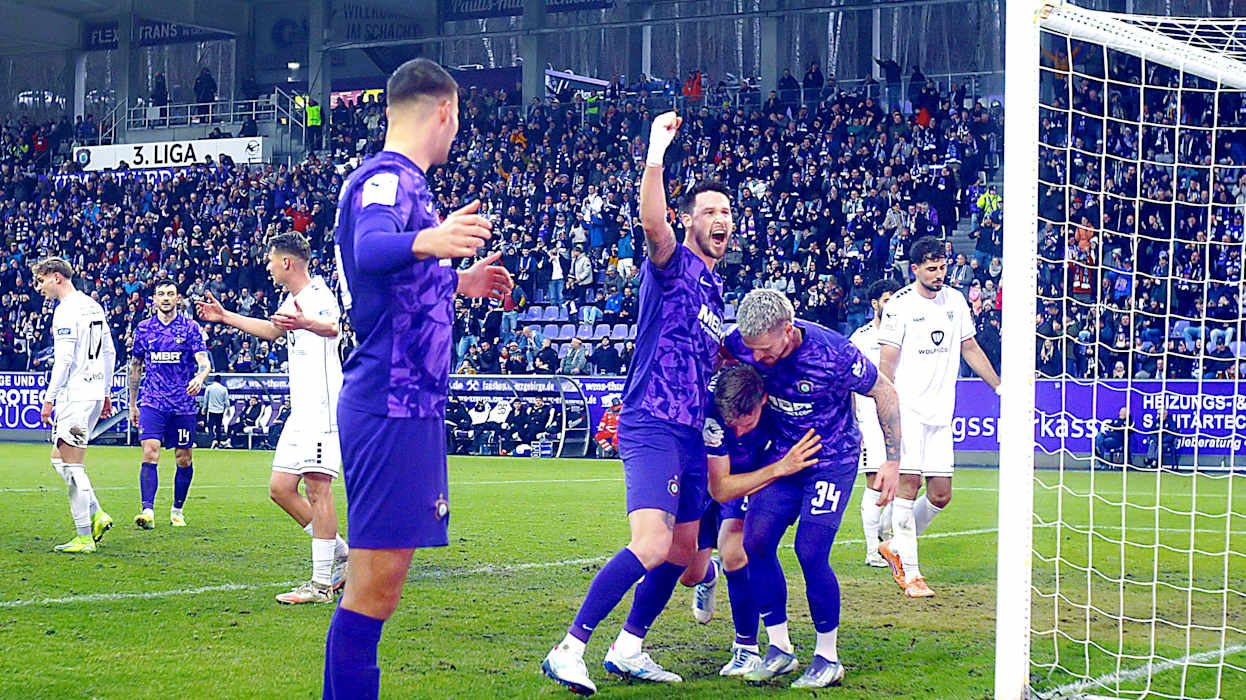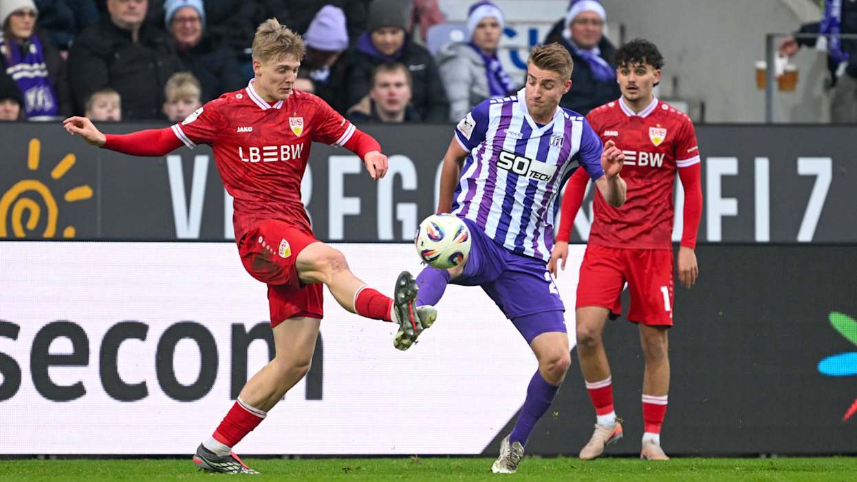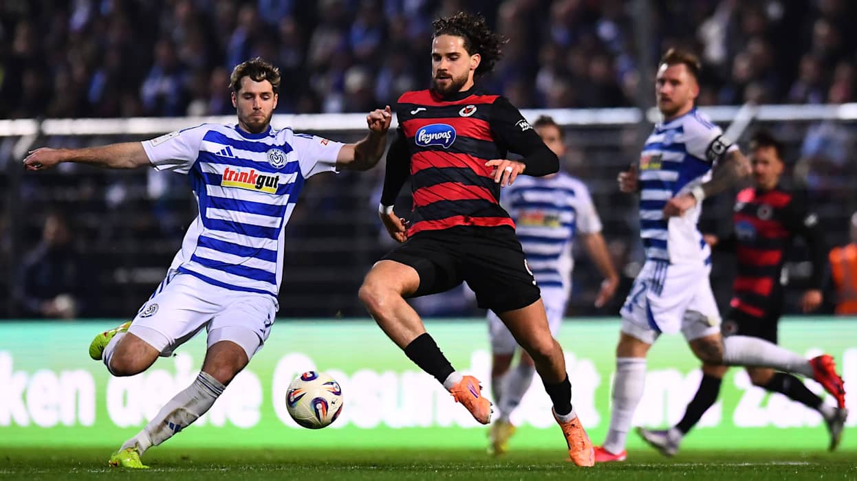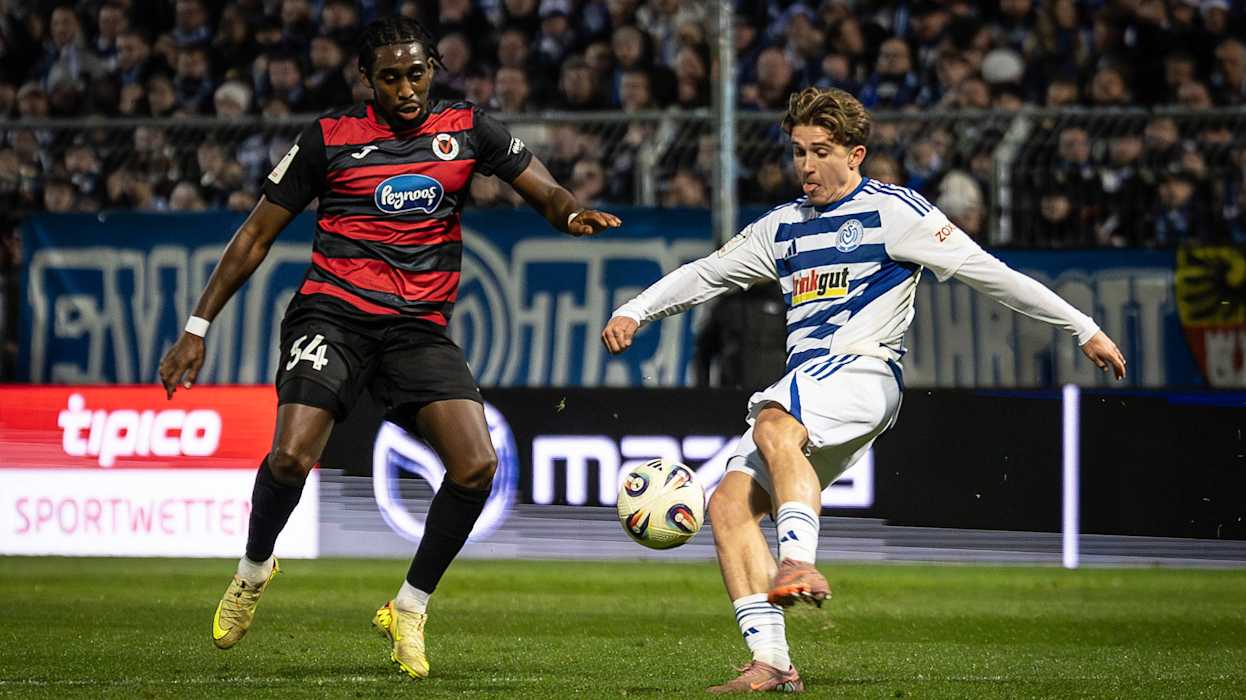 Der MSV Duisburg fiel durch das 0:0 bei Viktoria Köln auf den Relegationsplatz zurück. Auch Hansa Rostock (1:1 gegen den 1. FC Saarbrücken) und der VfL Osnabrück (1:2 gegen den VfB Stuttgart II) mussten von der Spitzengruppe abreißen lassen. Am Tabellenende freute sich Erzgebirge Aue, das mit dem 4:0 (2:0) gegen Schlusslicht 1. FC Schweinfurt die Abstiegsränge verlassen konnte. Dort rangieren über den Jahreswechsel derweil der TSV Havelse und Alemannia Aachen, die sich beim 1:1 (0:0) ohne Sieger trennten. DFB.de hat die besten Bilder des Spieltags.
