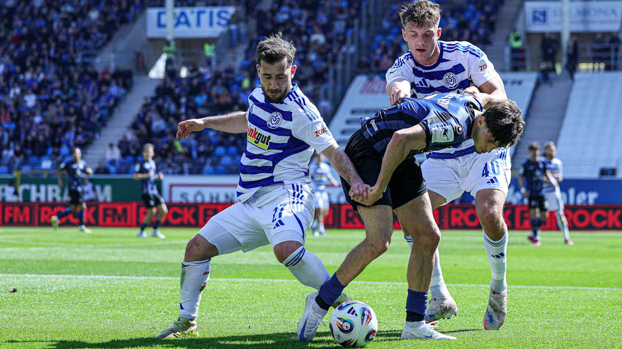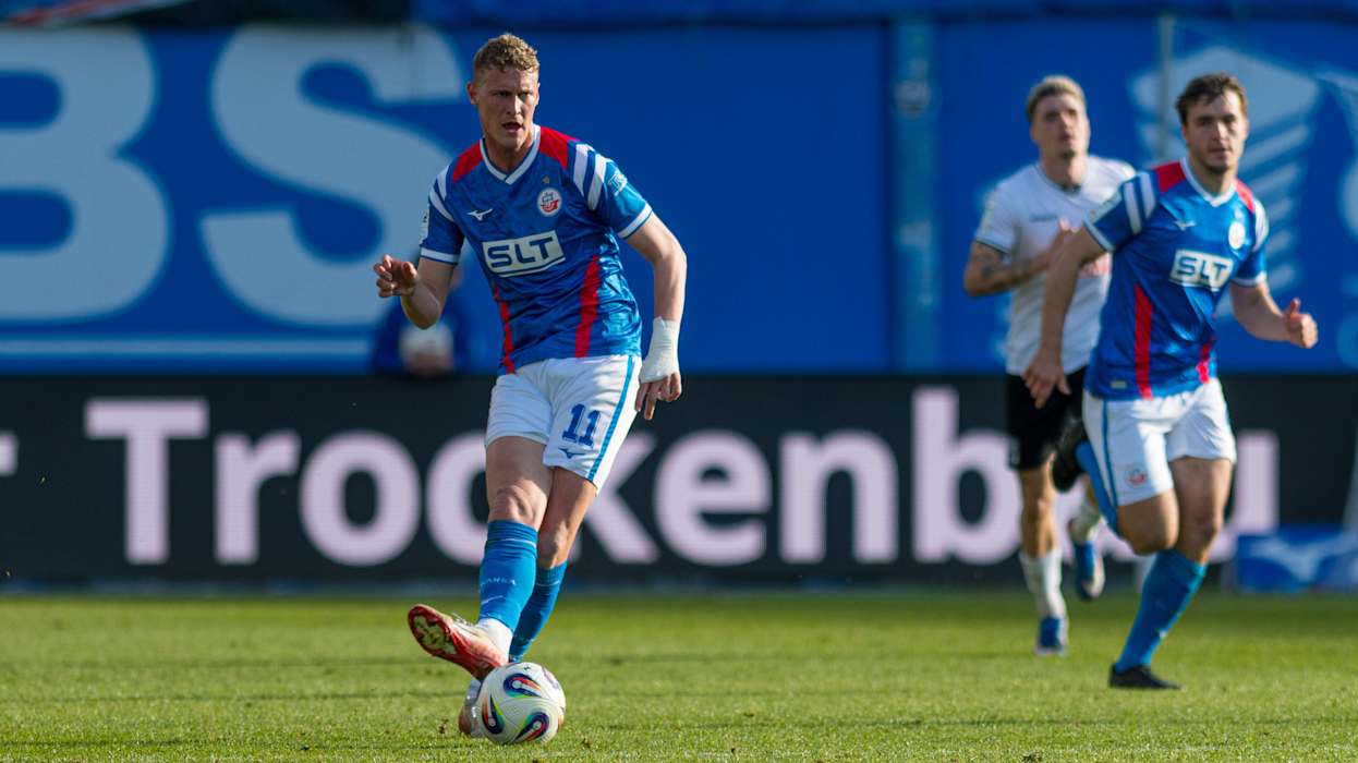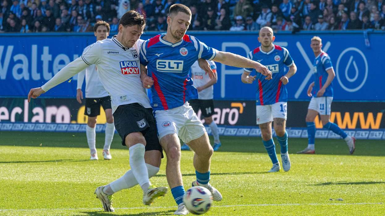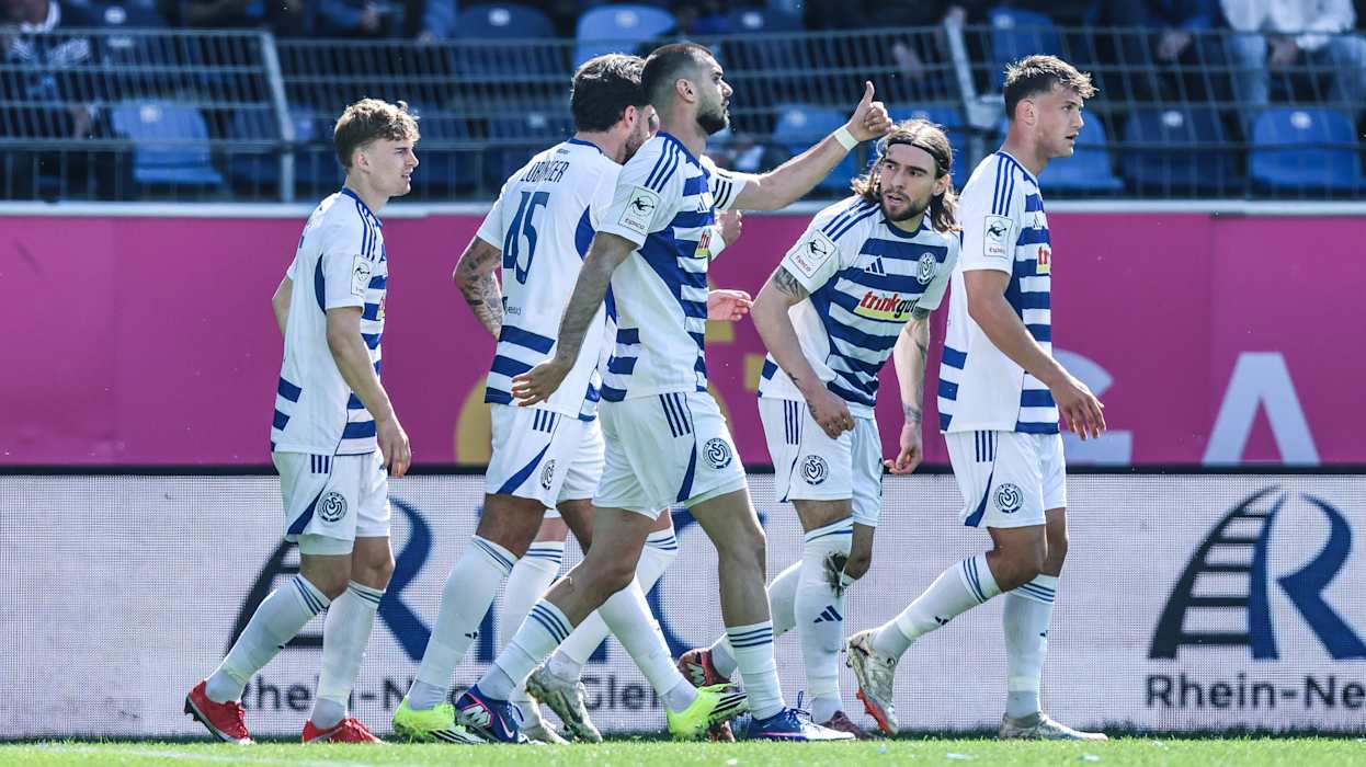Der MSV Duisburg (4:1 bei Waldhof Mannheim) und Hansa Rostock (5:1 gegen den SSV Ulm 1846 Fußball) bleiben auch im Aufstiegsrennen, der SC Verl muss nach dem 1:1 beim FC Erzgebirge Aue abreißen lassen. DFB.de hat die Bilder des 33. Spieltags.