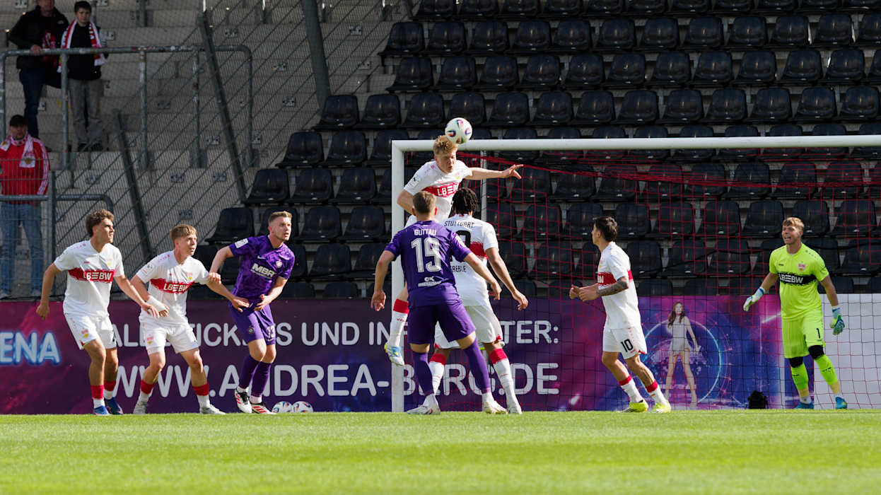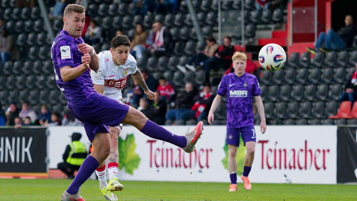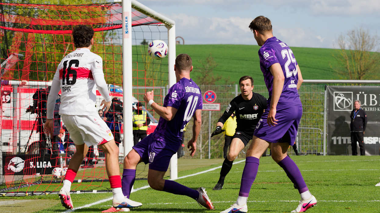 Im Abstiegskampf holt Erzgebirge Aue zwar ein 2:2 (0:2) beim VfB Stuttgart II, hat aber nur noch theoretische Chancen auf den Klassenverbleib. Der SSV Ulm 1846 Fußball verkürzte derweil durch das 2:1 (0:0) gegen den TSV Havelse den Abstand auf den ersten Nichtabstiegsplatz auf jetzt sechs Zähler. DFB.de hat die besten Bilder des Spieltags.