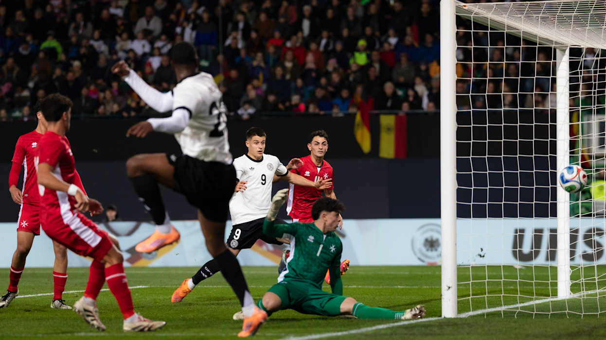 Ilyas Ansah und Aljoscha Kemlein sorgten innerhalb weniger Minuten durch Passkombinationen für Gefahr: Erst setzte Ansah Kemlein in Szene, wenig später erwiderte sein Kollege von Union Berlin die Vorlage - beide Abschlüsse waren jedoch zu ungenau (16., 19.). Gerade Lennart Karl agierte als Aktivposten über rechts und stellte die maltesische Hintermannschaft vor Probleme: So zog der Münchener Teenager in der 33. Minute von rechts in die Mitte und schloss ansatzlos ab - der Ball rauschte nur knapp flach am rechten Pfosten vorbei. In der 35. Minute kam Ansah zu einer Großchance: Kömür lief bis zur Grundlinie durch und flankte in der Hinterraum, wo Ansah lauerte, doch den Ball per Volley mit Aufsetzer aus knapp sechs Metern über das Tor setzte.