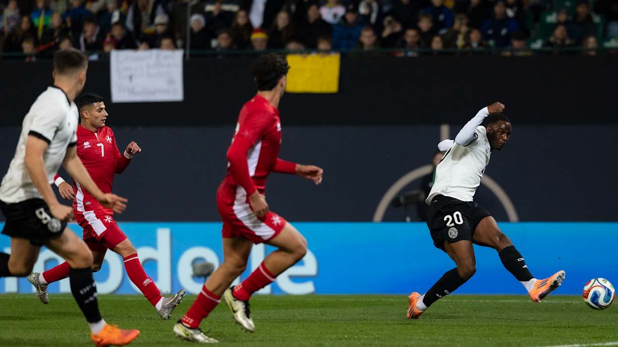 Schließlich belohnte Lennart Karl sein Debüt bereits in der ersten Halbzeit: Kemlein steckte durch in den Strafraum, wo Karl von rechts einlief und den Ball mit links in die lange Ecke drehte (37.). Die deutsche Mannschaft spielte in der ersten Halbzeit mit viel Spielfreude auf, versuchte energisch nachzulegen und kam zu einigen Abschlüssen. Malta versuchte mitzuspielen, doch konnte sich kaum aus der eigenen Hälfte lösen.