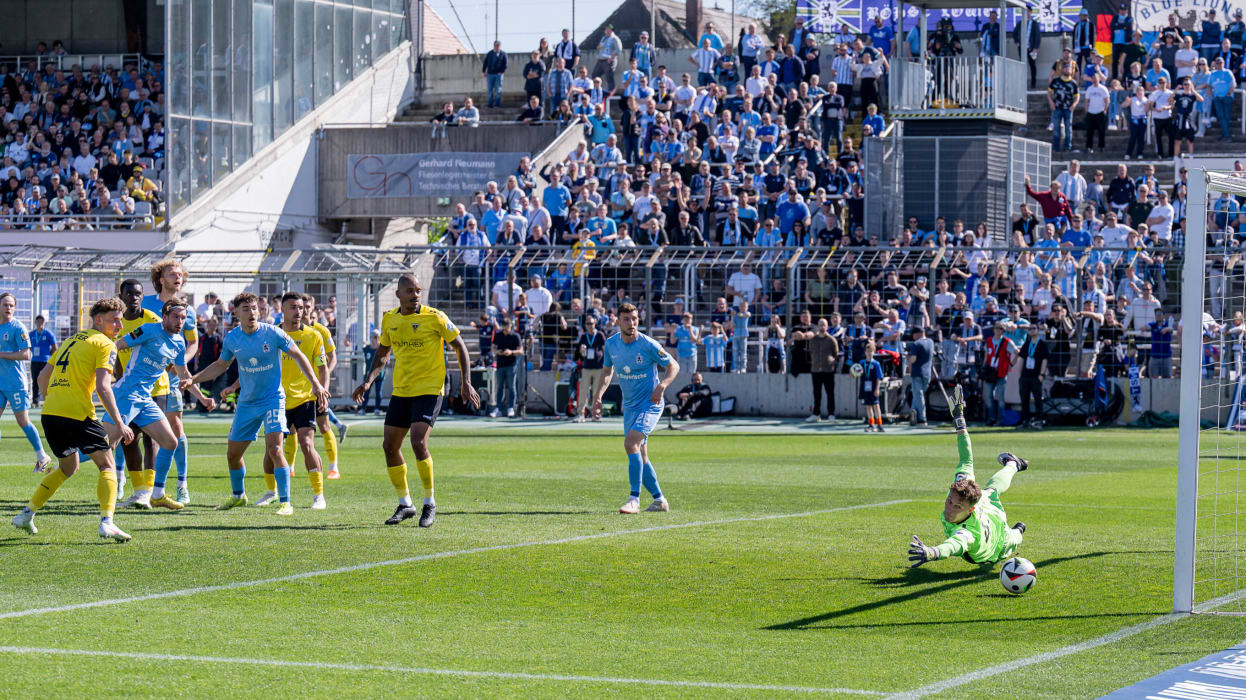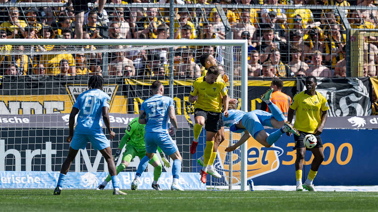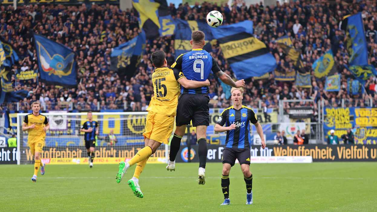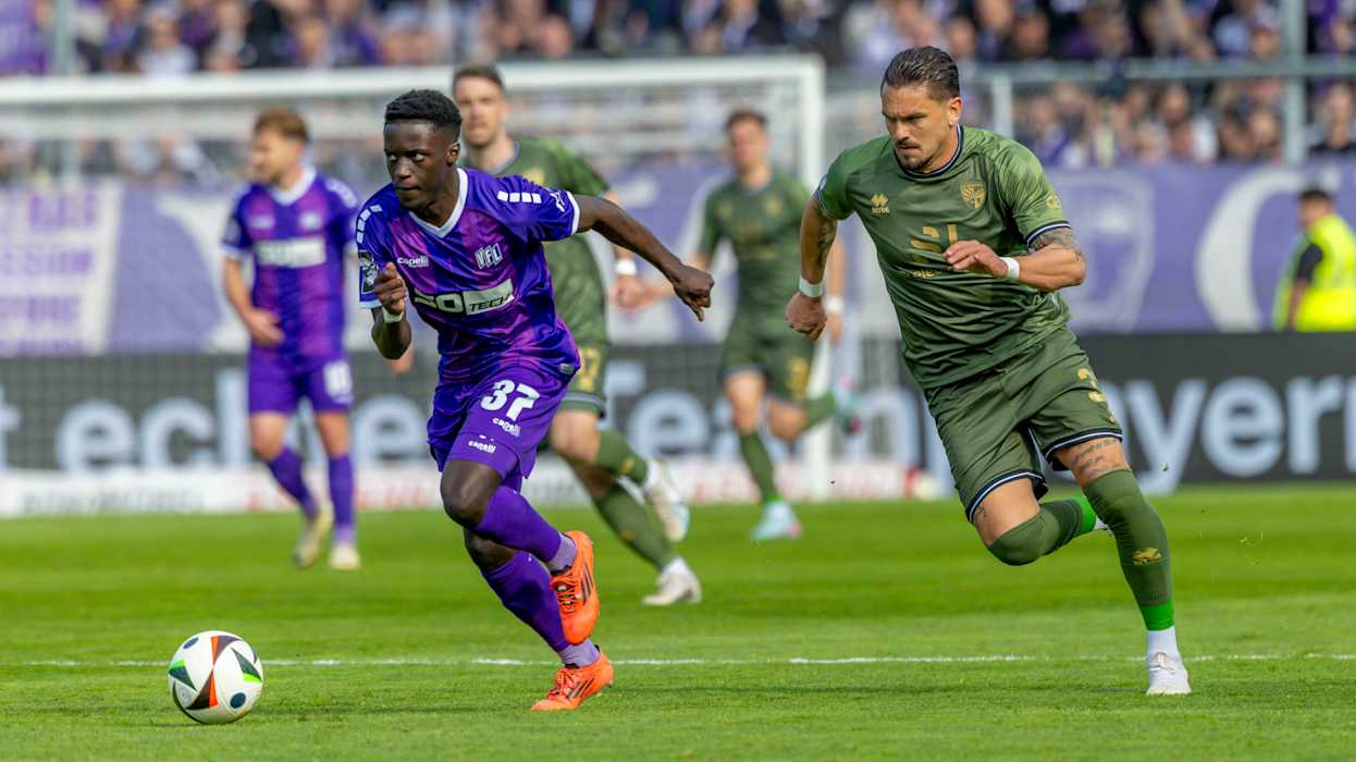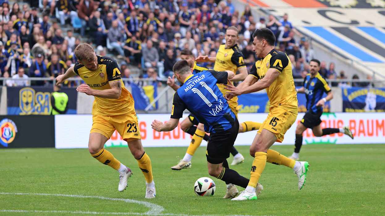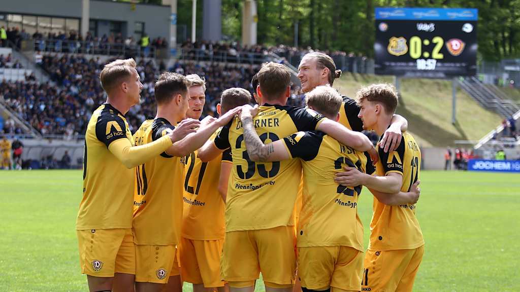 In der 3. Liga hat Dynamo Dresden das Topspiel gegen den 1. FC Saarbrücken 4:1 (2:1) gewonnen und steht weiter an der Tabellenspitze. Diese hatte zuvor für eine Nacht DFB-Pokalfinalist Arminia Bielfeld inne, der am Samstag Hansa Rostock 4:0 (3:0) besiegte. Hinter Dresden und Bielefeld klettert Energie Cottbus klettert dank eines 1:0 (0:0)-Heimsieg gegen Viktoria Köln auf den Relegationsplatz. Der VfL Osnabrück setzt sich gegen den FC Ingolstadt 1:0 (1:0) durch und sammelt somit wichtige Punkte im Abstiegskampf. Der FCI hingegen wartet nun seit vier Spielen auf einen Sieg. DFB.de hat die besten Bilder des 34. Spieltags.