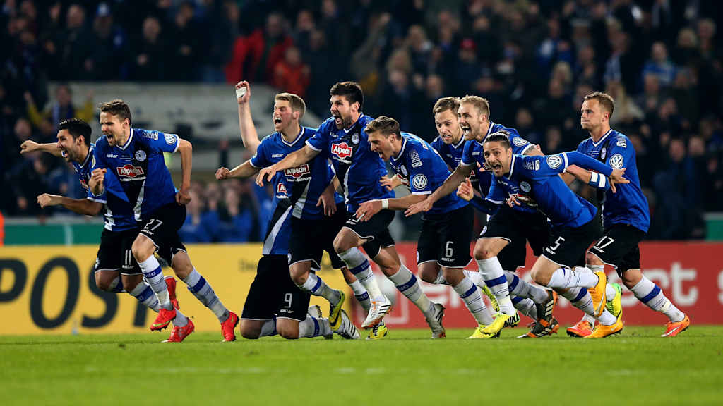 Danach gab es noch zwei Sensationen, jeweils zum Nachteil von Borussia Mönchengladbach. 2015 musste der Bundesligist dorthin, wo am Dienstag Werder Bremen erneut sein Glück versucht: auf die Bielefelder Alm. Eben dort hatte der Drittligist schon besagte Bremer und Hertha BSC eliminiert und nun waren die Borussen dran. Nach 120 Minuten und einem 1:1-Spielstand ging es ins Elfmeterschießen, in dem Arminen-Keeper Alexander Schwolow mit seiner Parade gegen Ibrahima Traoré zum Helden des Tages wurde. Auf der Arminen-Bank saß mit Norbert Meier ein früher Borussen-Spieler und –trainer.